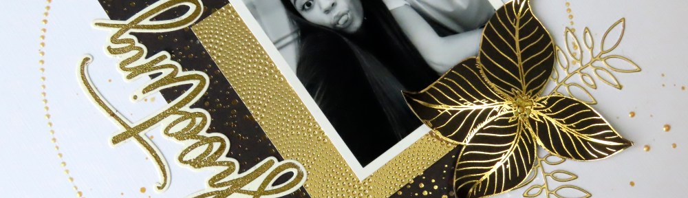 Et voici le résultat en ajoutant un bout de papier de la collection, du papier doré embossé, un titre, deux feuillages et quelques gouttes d’aquarelle dorée.