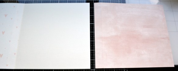 C’est bon, tout est est coupé ? Alors c’est parti pour l’assemblage ! Commencer par prendre votre papier avec les coeurs de 19×19 cm et un morceau de papier uni écru de 21x19cm, plié à 2cm. Encoller les 2cm et placer ce papier sur votre droite.