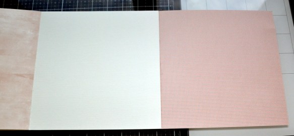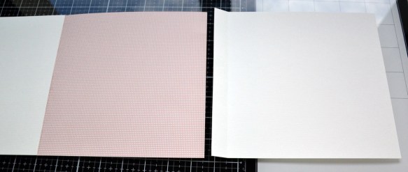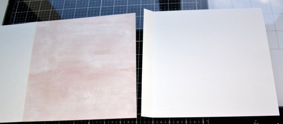 Prendre le morceau de papier rose faux uni de 21x19cm, plié à 2cm. Mettre à droite du morceau écru et encoller les 2cm.