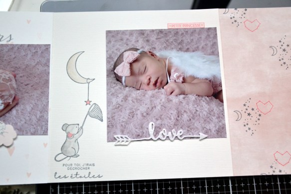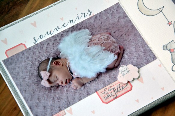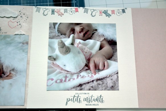 Sur la page rose, j’ai alterné 2 tampons avec 2 couleurs d’encre. J’ai collé ma photo de 13x13cm. Puis, j’ai réalisé mes tampons et ajouté les découpes de nuages, réalisées dans la feutrine écrue.