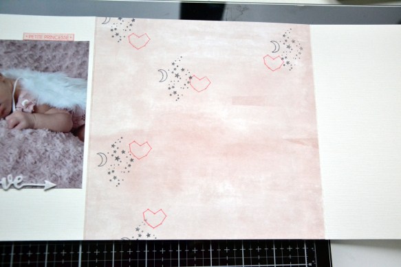 Première double page, celle avec les petits coeurs et la page écrue à droite. On ne colle rien sur la structure pour l’instant.