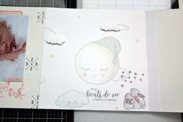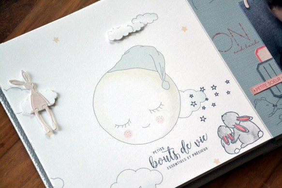 Sur la page suivante, avant de coller la page avec la lune, j’ai réalisé le tampon « Famille lapin ». J’ai colorisé les lapins au néocolor noir très dilué et les oreilles au feutre rose. Dans le même papier, j’ai recoupé des nuages que j’ai collés au 3D fin. La découpe « doudou » est collée sur le nuage.