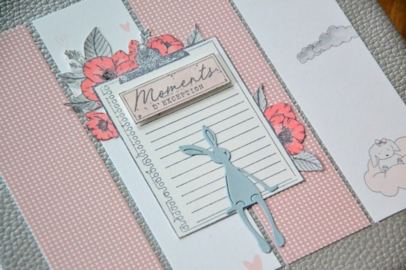 Décoration de la couverture : 4 bandes de papier imprimé de 4x15cm. Le tampon « Notes fleuries » est réalisé dans une chute de papier écru. Les feuilles sont colorisées en noir très dilué et les fleurs au crayon rose. Le tampon « Moments d’exception » est collé en 3D. Pour finir, la découpe « doudou » est réalisée dans une chute de gris et collée !