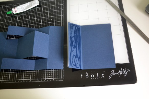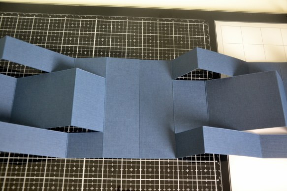 Prendre vos papiers bleu marine, couper 2 morceaux de 30x15cm et réaliser les découpes et pliages suivants :