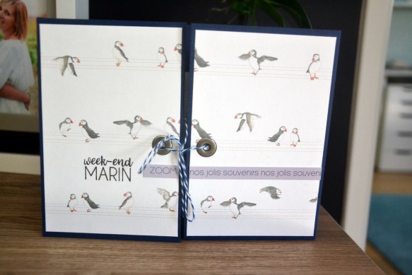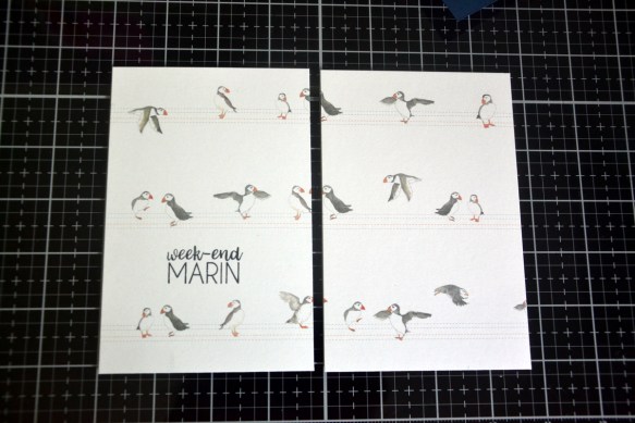 La couverture : dans le papier avec les macareux, couper 2 morceaux de 9.5×14.5cm, coller face à face pour garder la continuité des images.