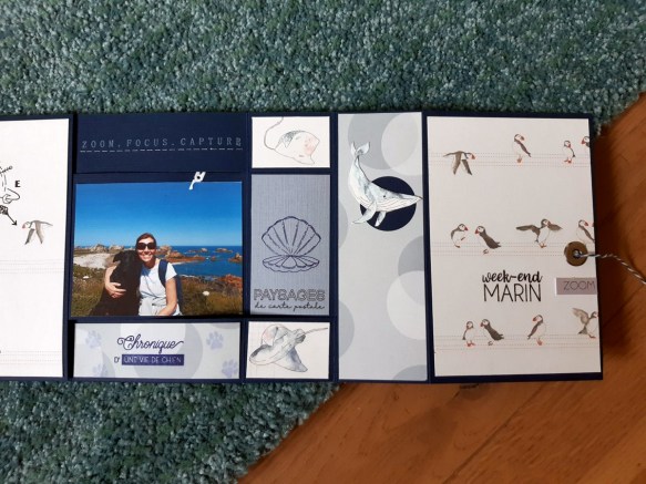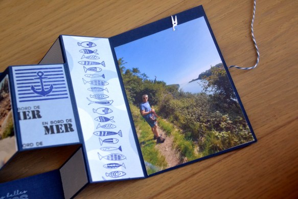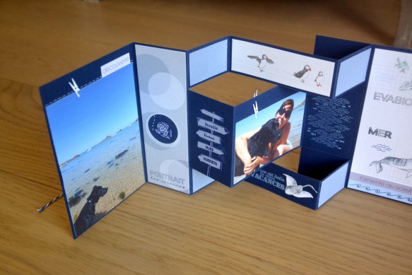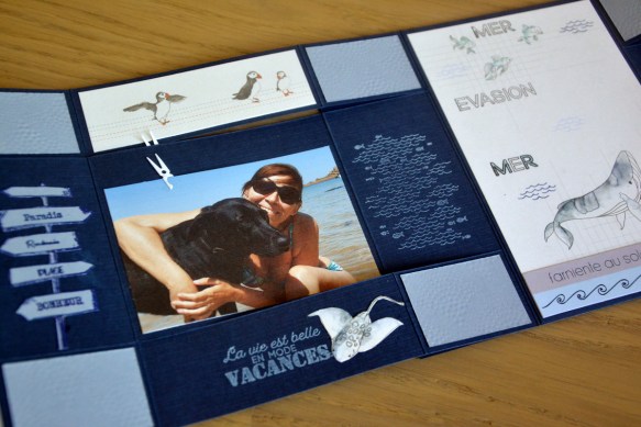 Un morceau de papier imprimé avec les ronds, perforé à la perforatrice ronde : un poisson Comptoir du scrap a été réalisé dans une chute de bleu clair, collé dans le rond et j’ai rajouté des bulles au crayon blanc. En bas, tampon « portrait des vacances » de Chou Flowers.