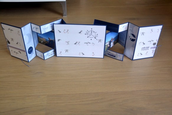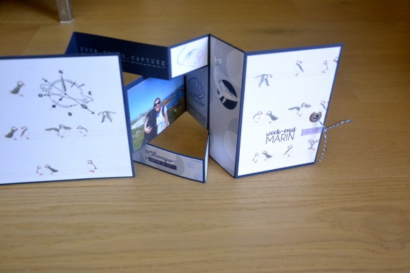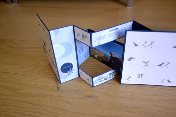 On retourne : on commence par coller un morceau de 19.5×14.5cm (pris dans le papier avec les macareux pour moi). J’ai tamponné la boussole de la même planche Mes p’tits ciseaux.