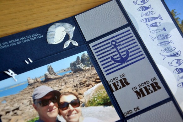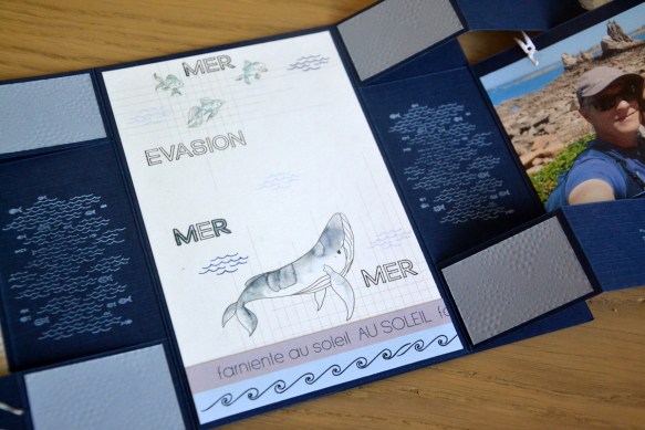 Encore à droite, 2 morceaux de papiers imprimés (choisissez ceux qui vous plaisent), un morceau bleu clair de 4.5x8cm au centre avec le tampon « coquille » de Chou Flower et le texte « Paysages de carte postale ». Pour finir, le dernier morceau de papier imprimé avec les bulles, perforé, et devant lequel, j’ai collé une baleine découpée dans le papier. ![]()