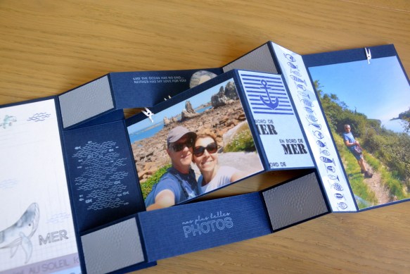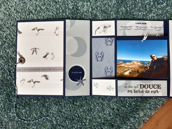 Tampon de panneaux Comptoir du scrap, avec les petits mots de la même planche à l’intérieur. Au centre, une photo de 9.5×6.5cm avec une découpe pince à linge (elle y est sur toutes les photos). En bas, le tampon « la vie est belle » de F. Design et j’ai découpé une raie dans le papier imprimé. En haut, une bande de papier avec les macareux de 9.5x3cm.