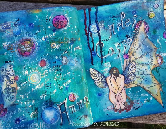 Such a beautiful page… the white writing makes it so personal. I love the circle stamps, like bubbles dancing around the page, and the winged woman has such a touching posture – she tells stories with the position of her body. Wonderful colours too.