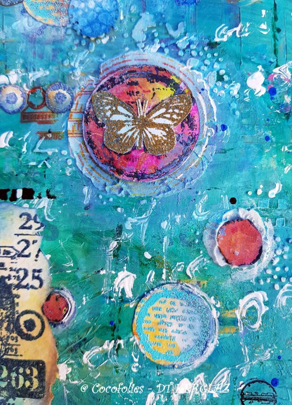 Mon fond est réalisé aux peintures acryliques, j’ai utilisé aussi de la modeling paste (pâte de texture blanche) que j’ai appliqué au couteau à peindre sur le pochoir #6 d’AAL & CREATE. Elle disparaît un peu du fait de la photo seule malheureusement, comme toutes les parties texturées, difficiles à montrer… mais de près, elle est bien visible sous le rond et le papillon qui provient de ce très beau tampon Circles Galore de CARABELLE par Birgit Koopsen, un tampon que j’adore !