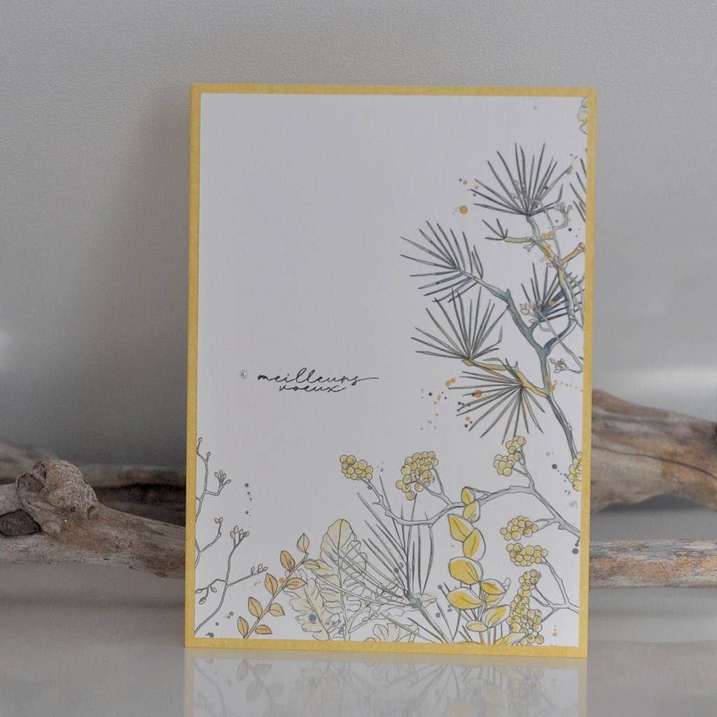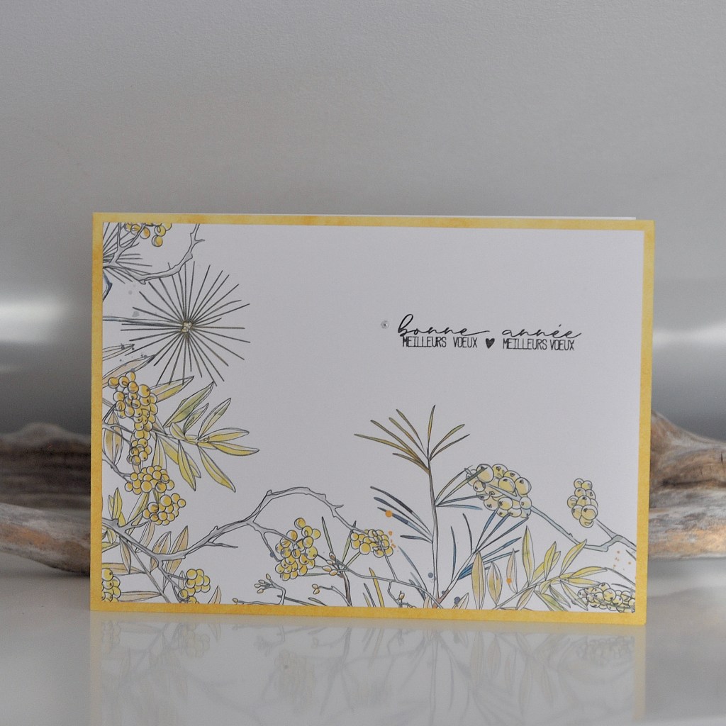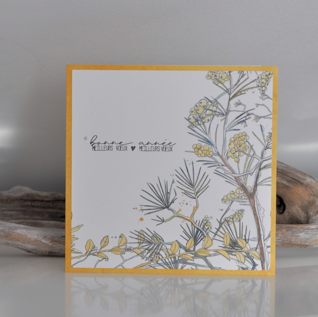 Pour finir, voici une dernière carte, réalisée dans des couleurs et un style encore un peu différent. avec un fond peint à l’acrylique que j’avais sur un coin de ma table…