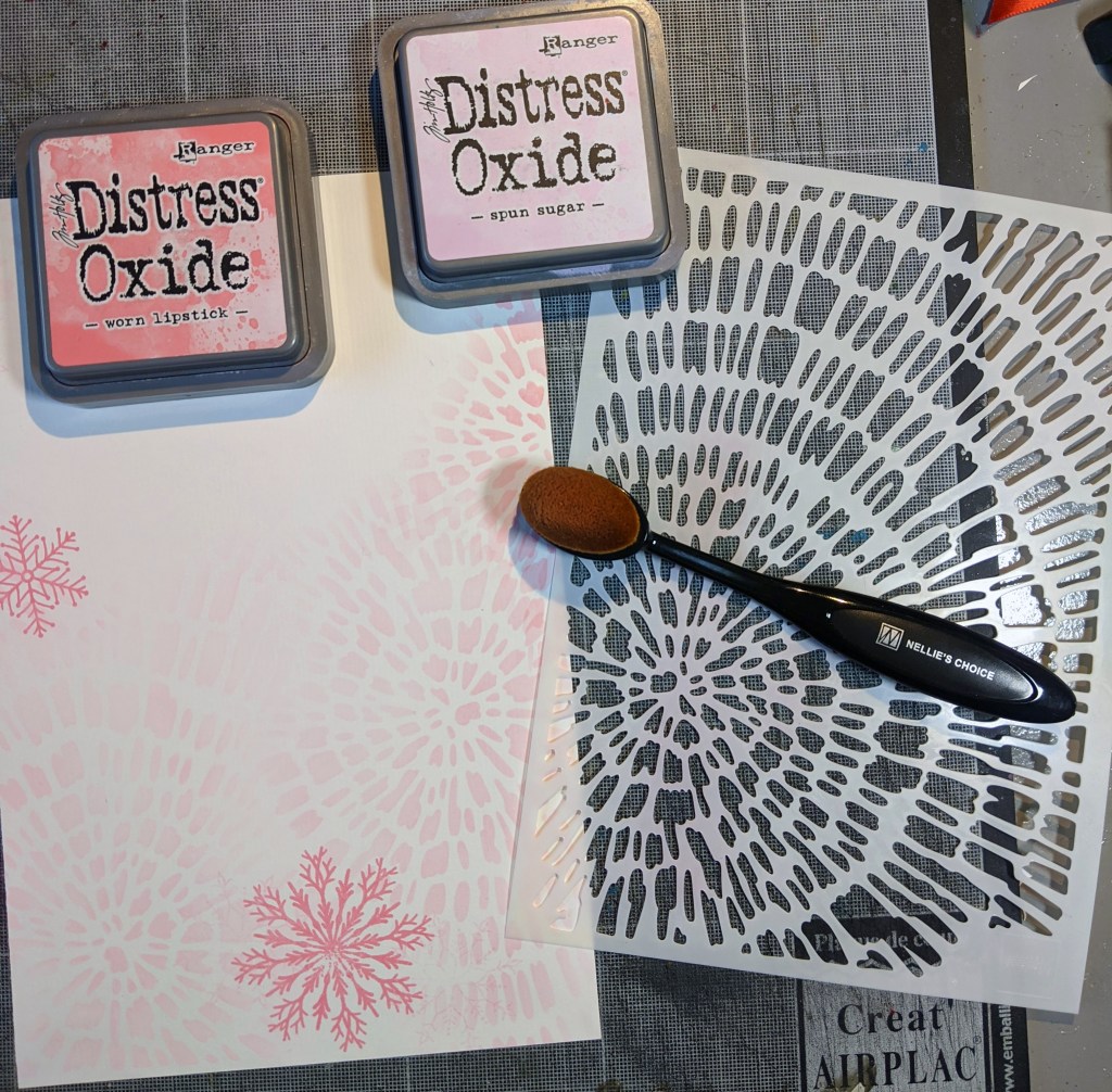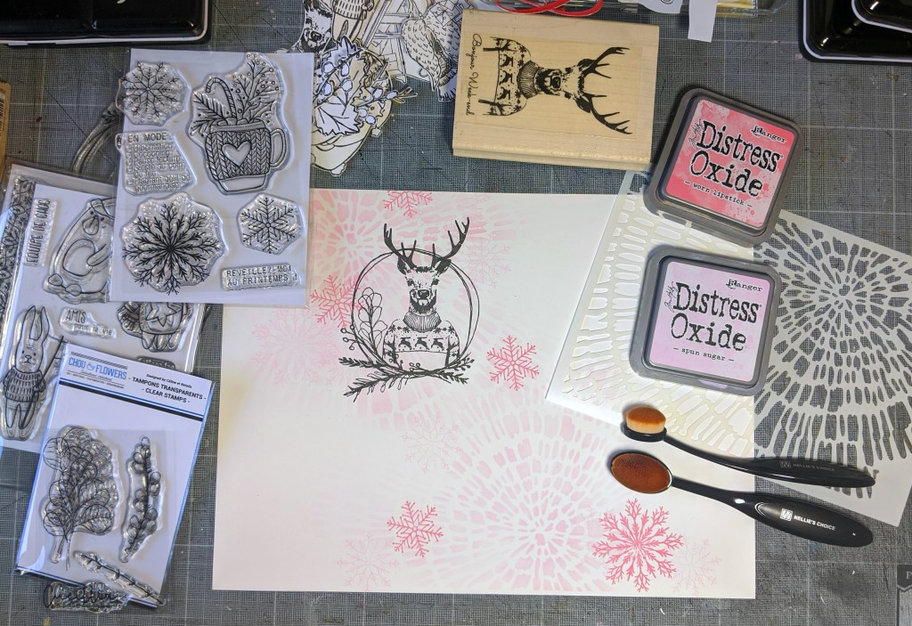 Voici une petite photo pour vous donner une idée de mon processus de création, ainsi que du matériel utilisé (hors fonds à la gel plate, car j’ai utilisé pour ma part différentes chutes que j’avais sous la main…).
