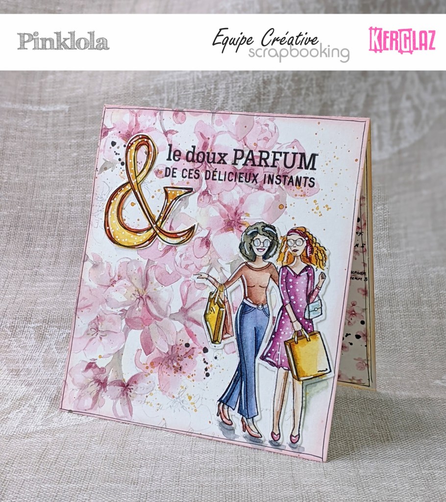 Je vous parle aujourd’hui d’une carte (13 x 14 cm) réalisée avec les jolis papiers fleuris Alexandra Renke, un délice à assortir et mettre en scène avec des tampons.