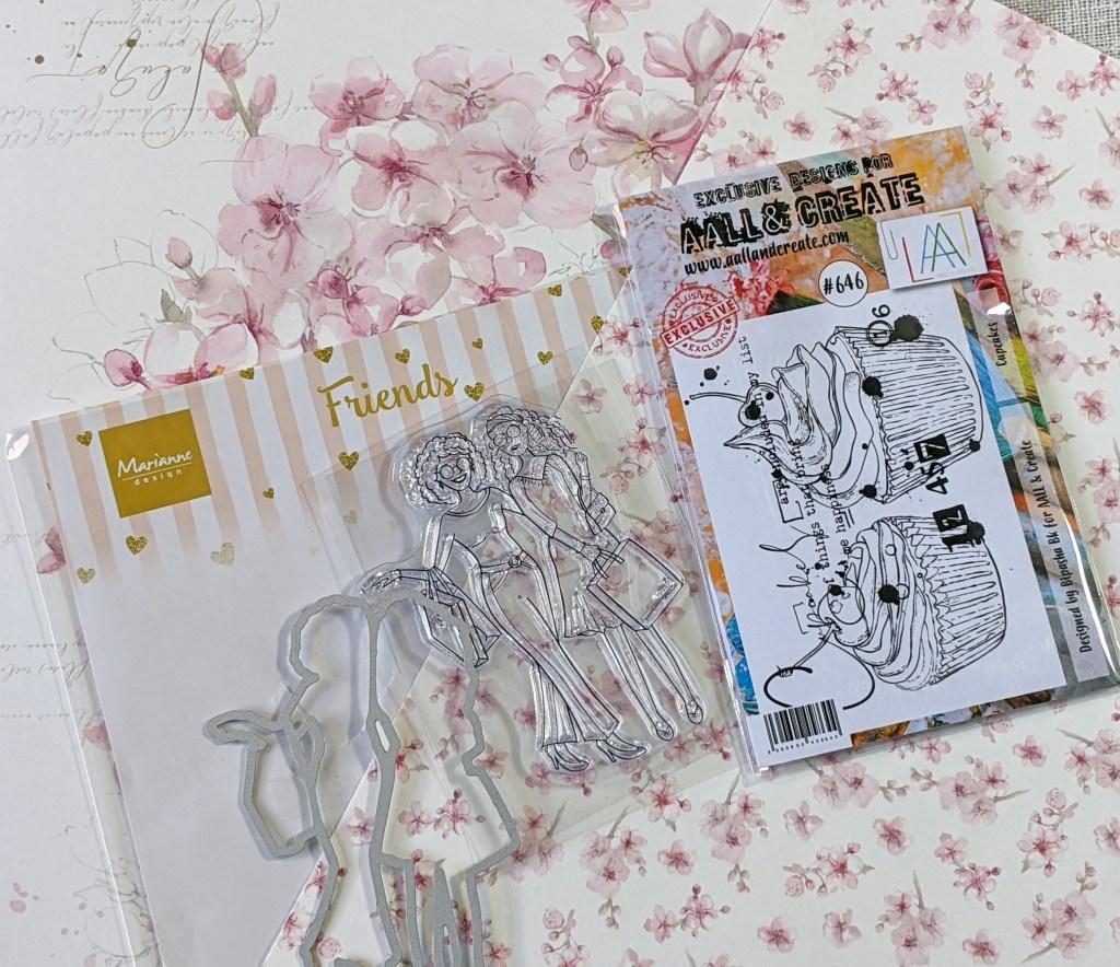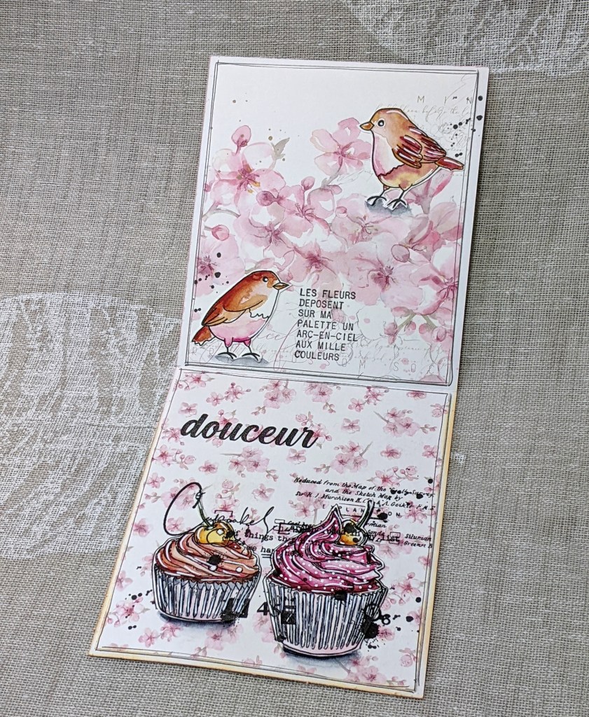 J’ai ajouté quelques tampons de différentes marques : Chou & Flowers, l’encre et l’image (les oiseaux et &) et le tampon Friends de la marque Marianne et tampons Aall & create (cup cake).
