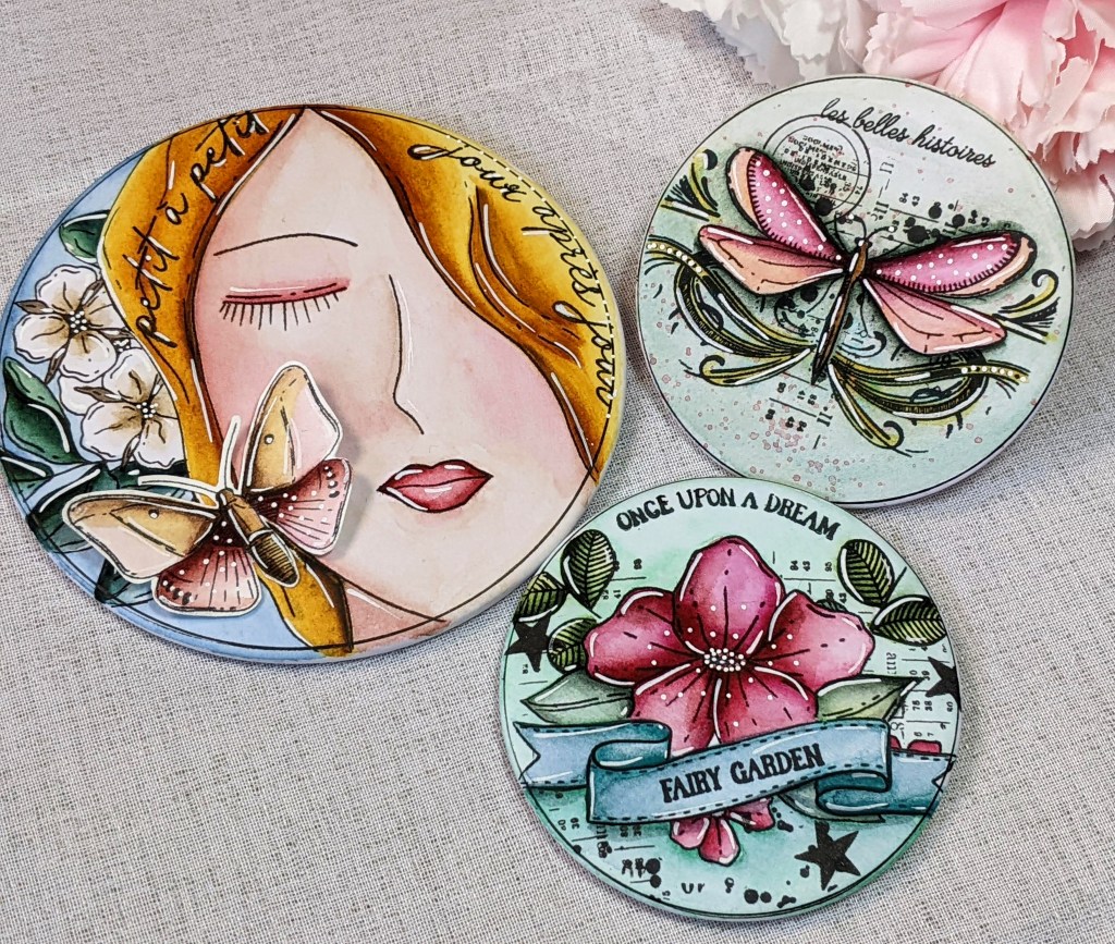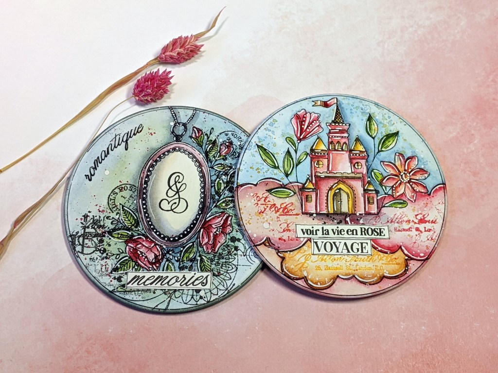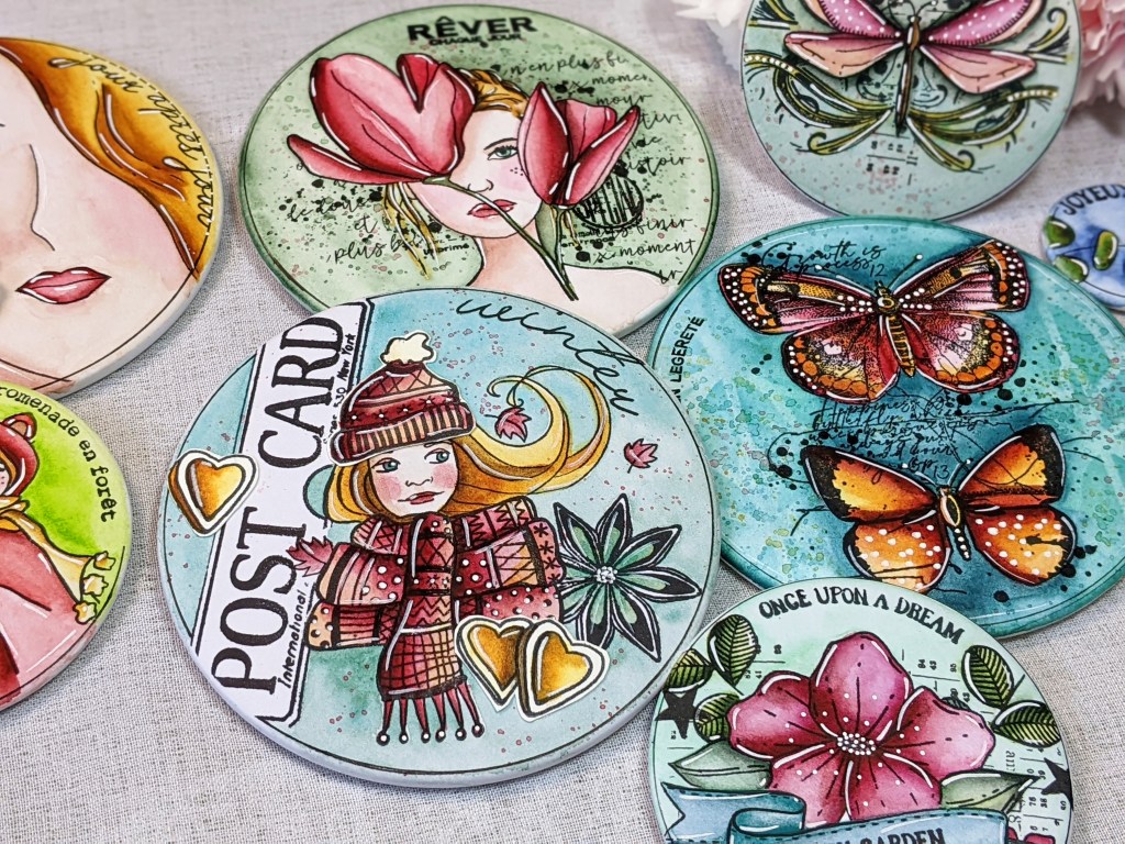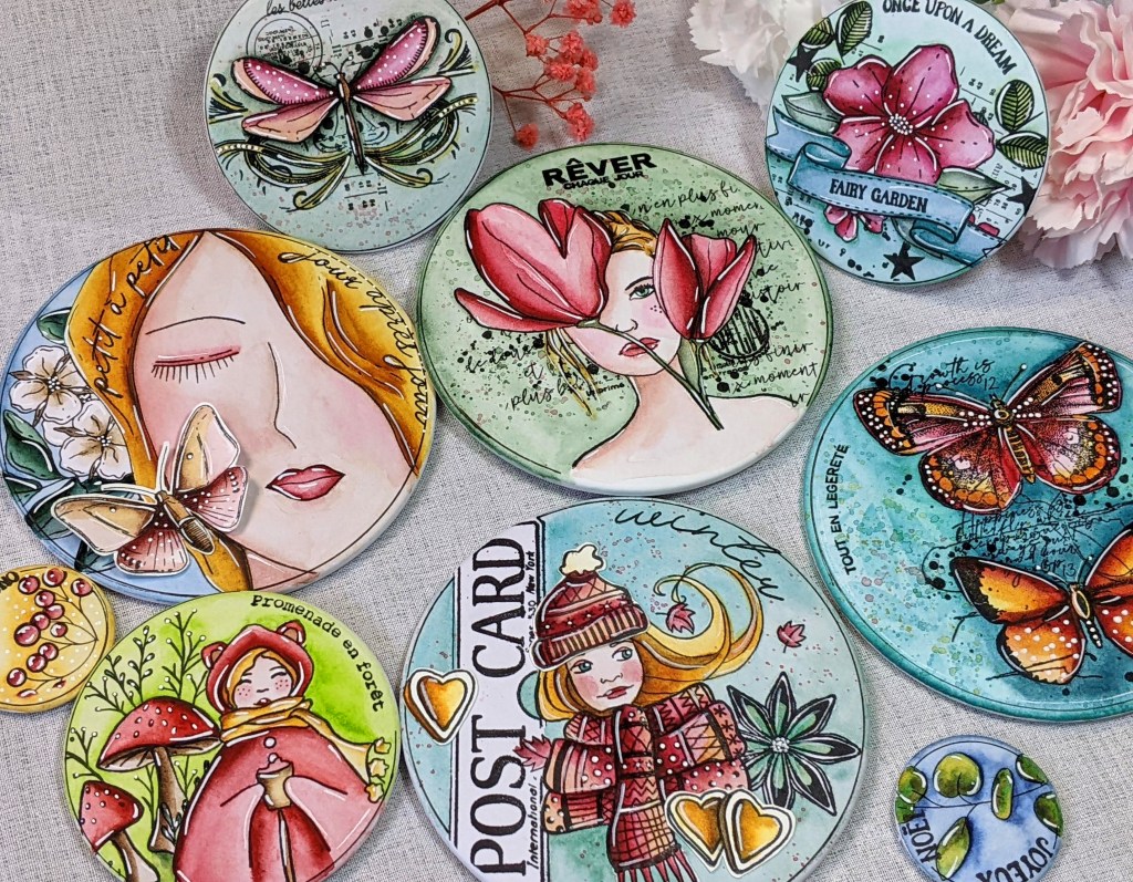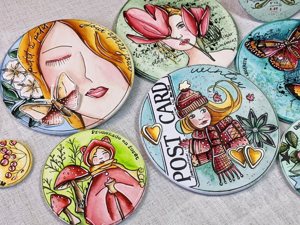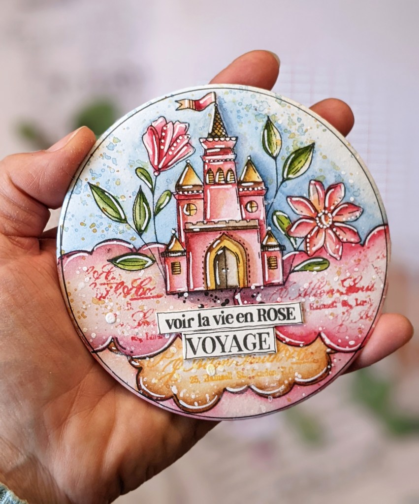 Mes images sont collées sur mes fonds au gel medium, ou placées légèrement en relief (la petite miss) avec de la mousse dimensionnelle. Je les ai tamponnées sur du papier aquarelle Florence, détourées en laissant un millimètre de marge, et colorisées tranquillement à l’aquarelle… Vous trouverez un grand choix de boîtes d’aquarelle fine en demi-godets, comme celles que j’ai utilisées, en boutique.