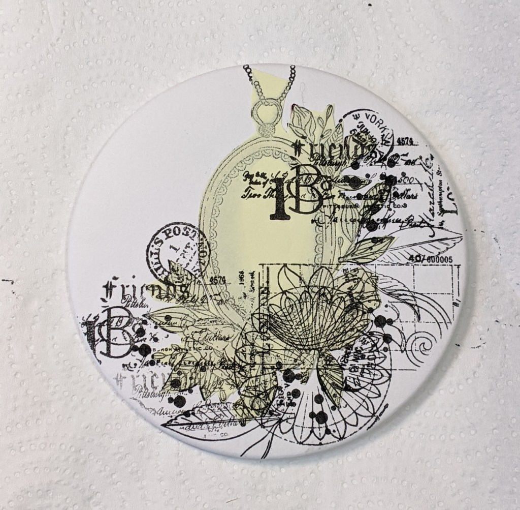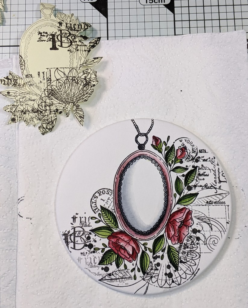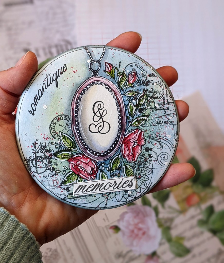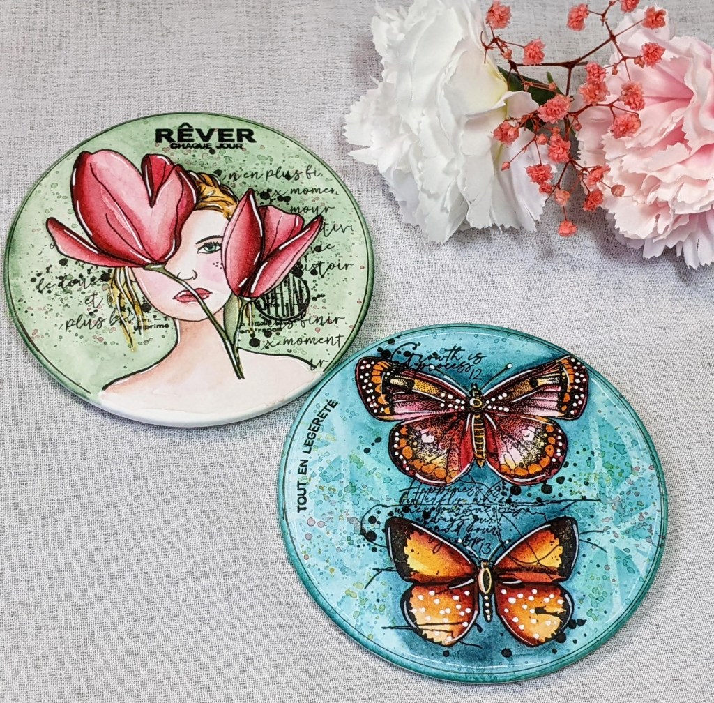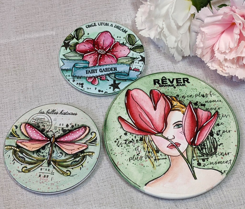 Mes images sont collées sur mes fonds au gel medium, ou placées légèrement en relief (la petite miss) avec de la mousse dimensionnelle. Je les ai tamponnées sur du papier aquarelle Florence, détourées en laissant un millimètre de marge, et colorisées tranquillement à l’aquarelle… Vous trouverez un grand choix de boîtes d’aquarelle fine en demi-godets, comme celles que j’ai utilisées, en boutique.