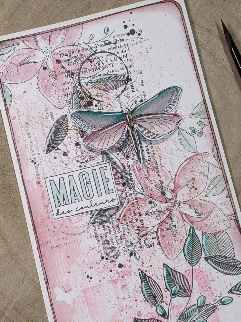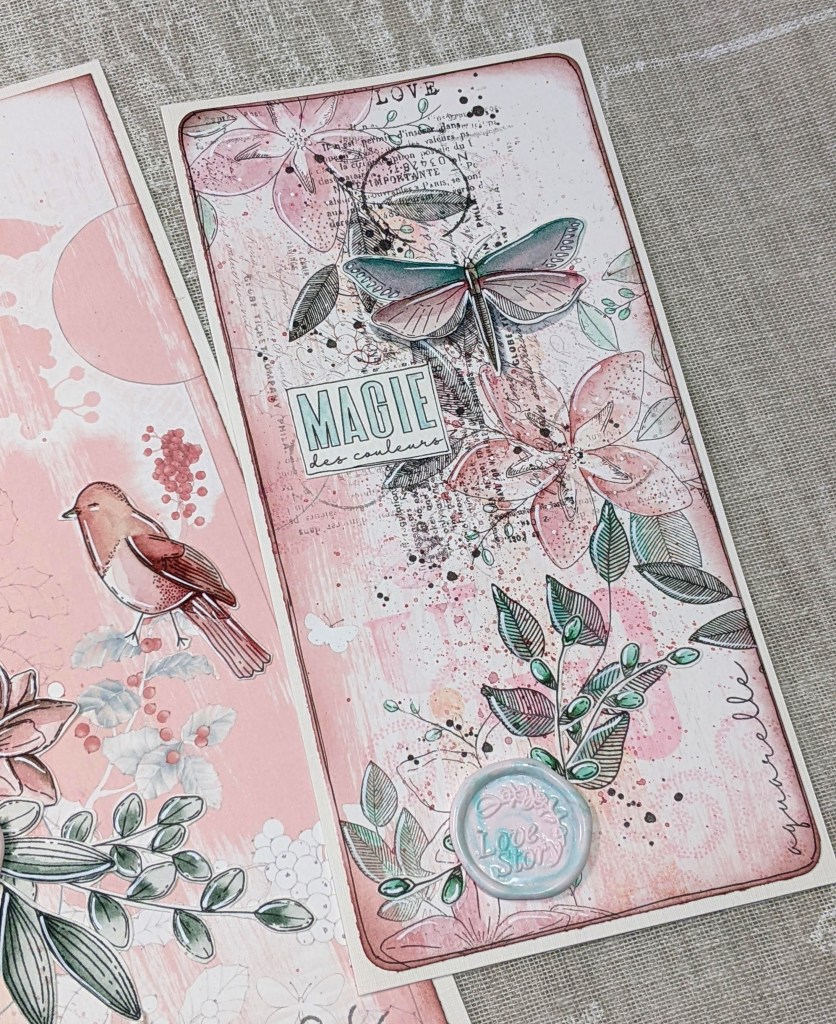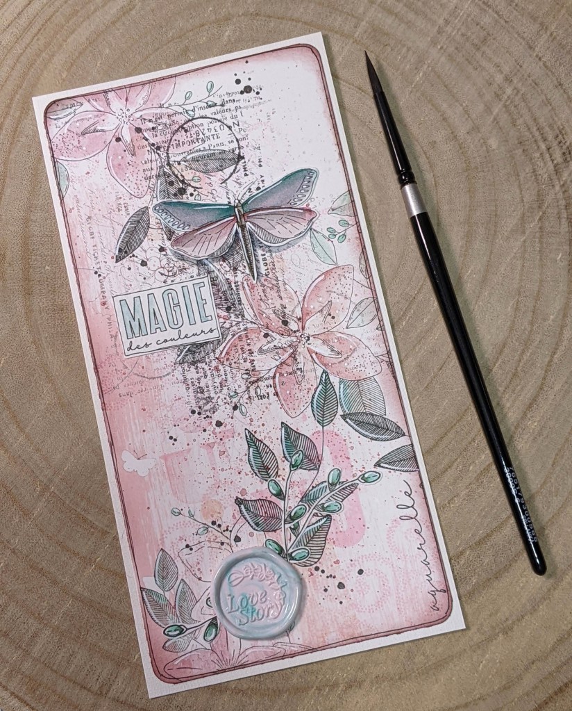 Cette carte mesure 22 x 11 cm. J’ai travaillé en finesse la superposition des motifs, des couleurs et des taches.