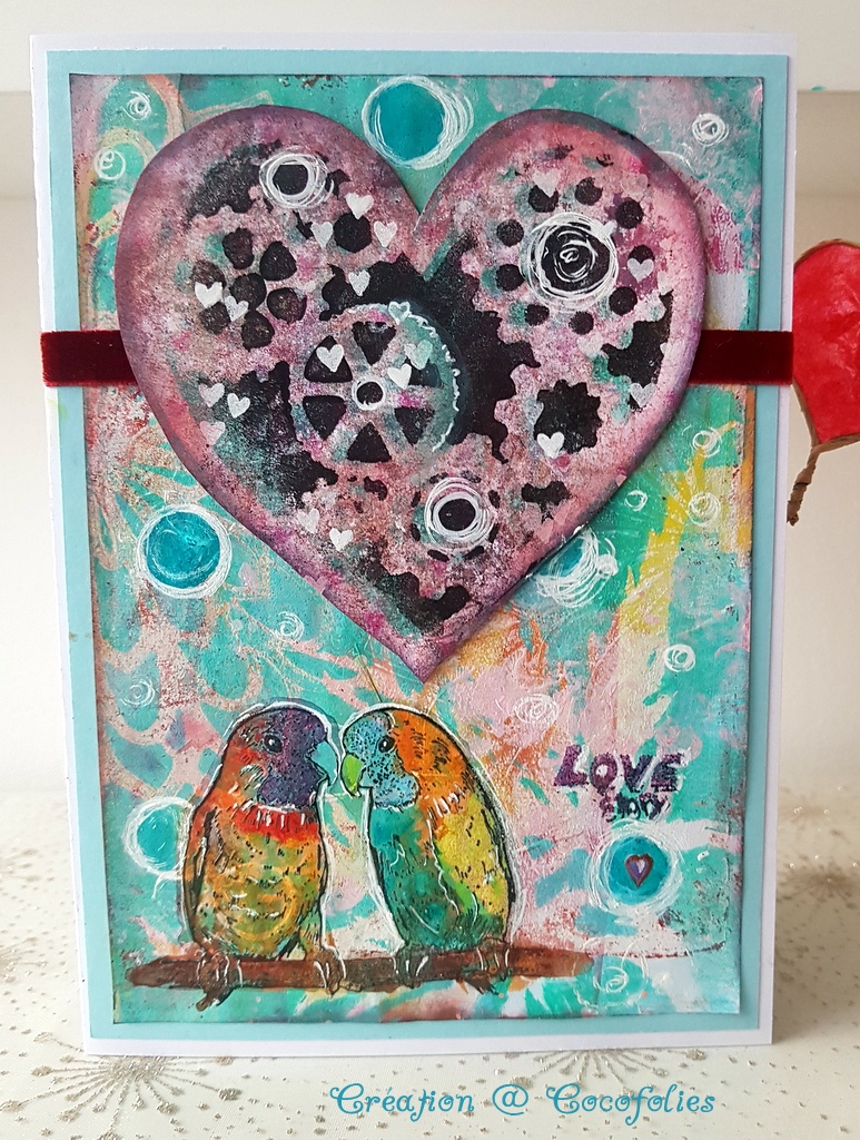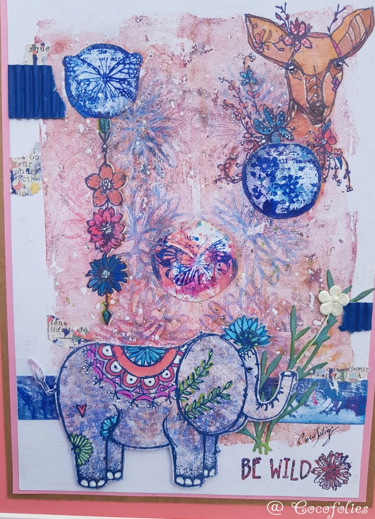Mes timbres sont tamponnés directement en place, et colorisés légèrement aux encres Distress et crayons Néocolor II. Vous avez un aperçu de mon processus un peu plus bas, et vous pouvez aussi retrouver sur CE POST un autre exemple d’utilisation.