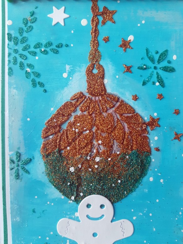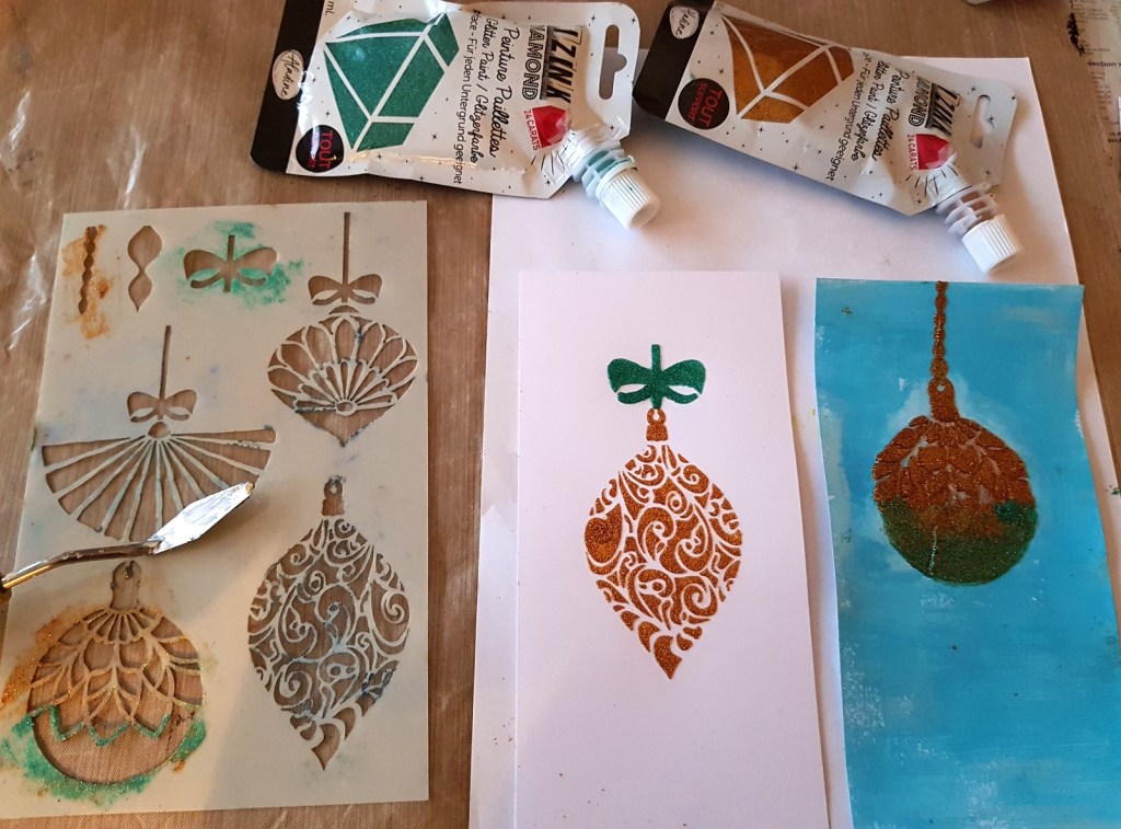 J’ai eu la joie en effet de tester pour réaliser ces cartes, les nouvelles peintures pailletées aux couleurs chatoyantes IZINK DIAMOND de Aladine. Je dois dire que j’en suis vraiment très contente !! J’ai joué avec du doré et du vert, les couleurs sont vives et puissantes, il s’agit de peintures vraiment très belles et faciles à appliquer, au pinceau ou mieux encore, au couteau à peindre sur des pochoirs. Elles ont la consistance d’une pâte de texture crémeuse, avec les paillettes en plus ! 😀