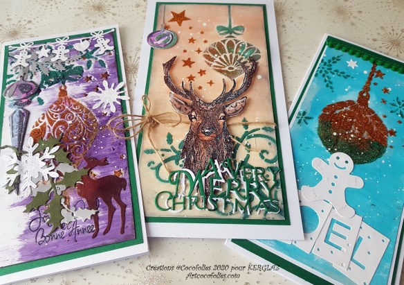 Je vous retrouve avec plaisir avec trois grandes cartes de Noël coloriées et texturées, faites avec mes produits Kerglaz pour l’essentiel. Notamment de très belles peintures pailletées IZINK, que j’ai découvert grâce à Hélène, et que j’ai appliqué avec bonheur !! Comme il est temps de commencer nos cartes festives, si vous êtes en recherche d’inspiration, et de quelque chose qui change de l’aquarelle ultra tendance, cet article peut vous aider à démarrer, ou varier vos modèles.