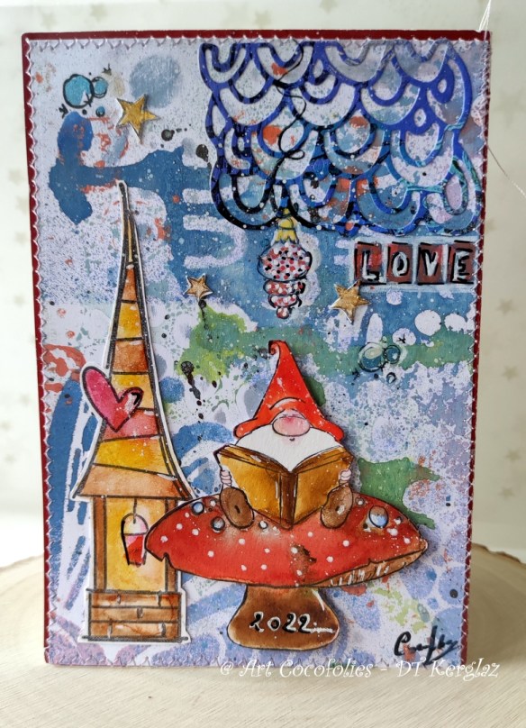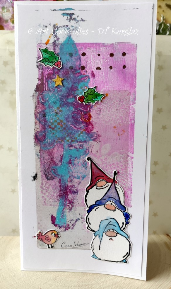 Une carte avec les gnomes Gnomes have feeling too à présent, que je me suis amusée à superposer. Le petit oiseau et les branches de houx proviennent du set « Miss Merry ».