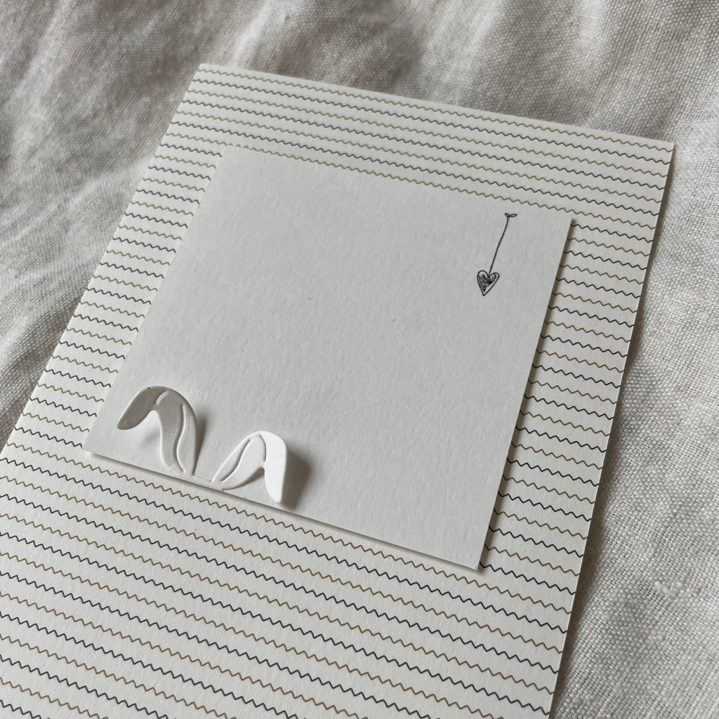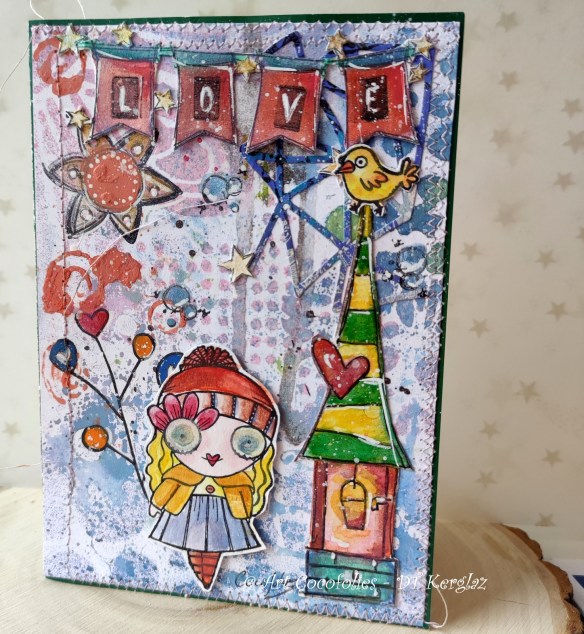 Une autre carte réalisée avec les restes de mes fonds aux encres, découpes du calendrier de Marlene, et tamponnades restantes de ce projet et d’un précédent avec ces mêmes tampons de style naïf (le coeur embossé), que vous pouvez revoir ICI.