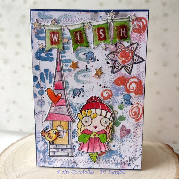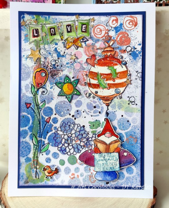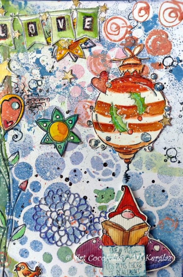 Enfin, j’ai collé mes tampons détourés et colorisés Chou & Flowers sur le fond.