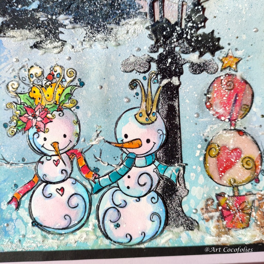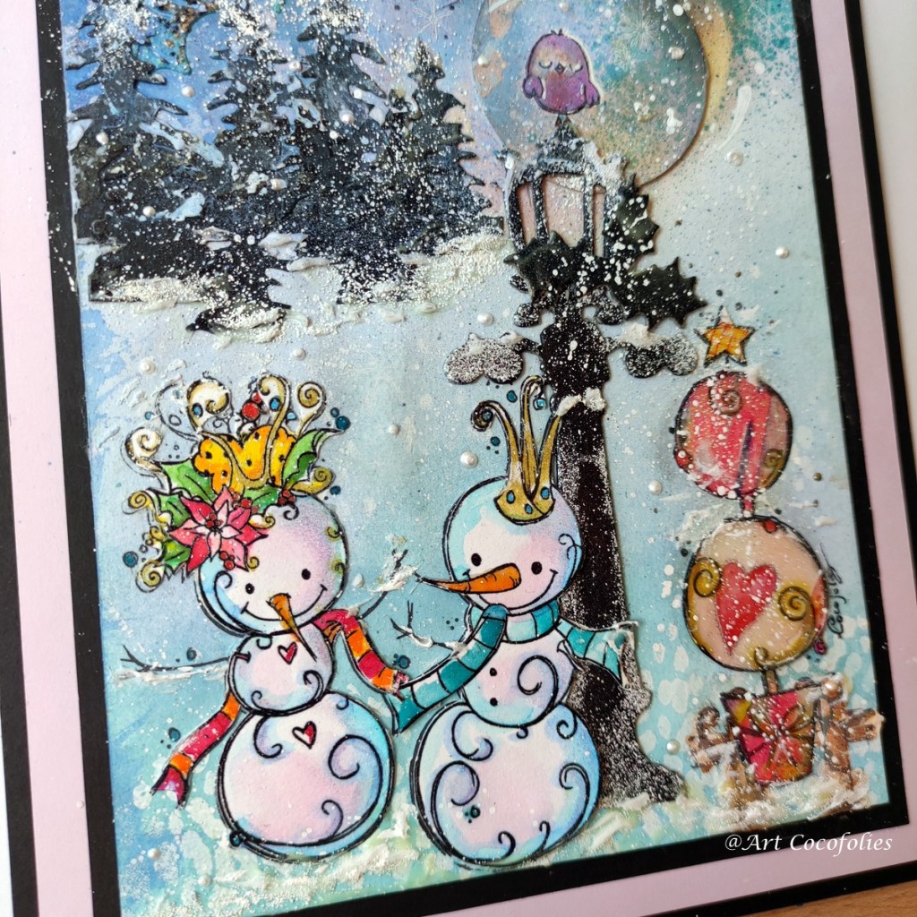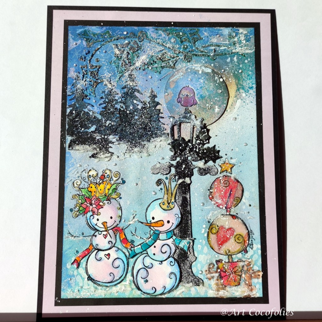 Beaucoup de texture, de jeu et de superpositions de matière sur cette première carte destinée à une amie très chère ! J’ai adoré coloriser à l’aquarelle ces deux adorables bonhommes de neige !!