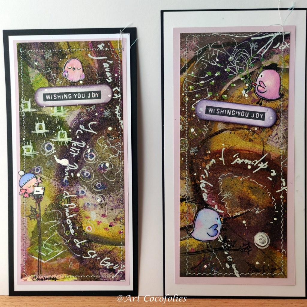 Je commence avec deux petites cartes, sur lesquelles j’ai joué avec « miss Merry » en complément des sets de tampons Polka doodles: