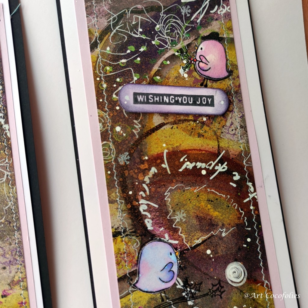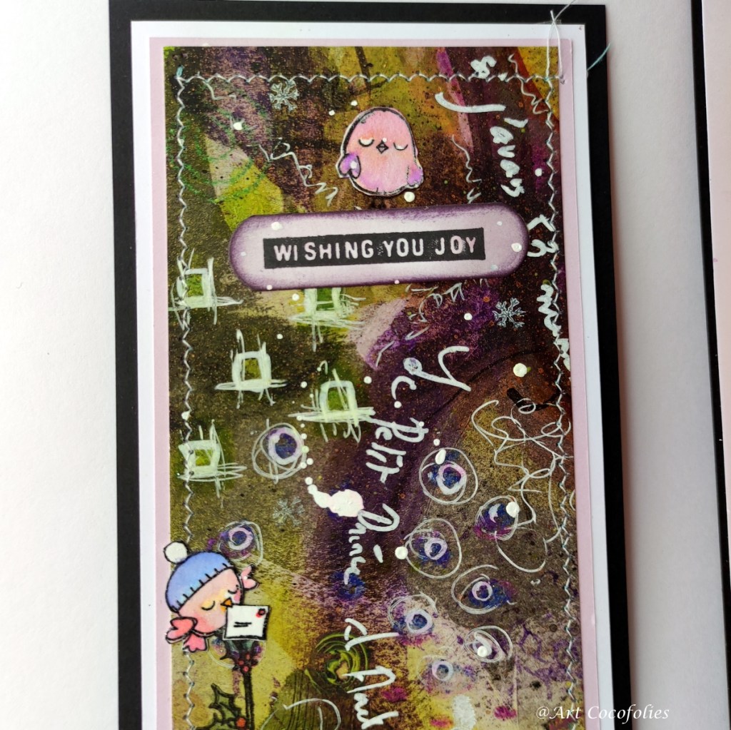 Pour finir, voici une dernière carte, réalisée dans des couleurs et un style encore un peu différent. avec un fond peint à l’acrylique que j’avais sur un coin de ma table…