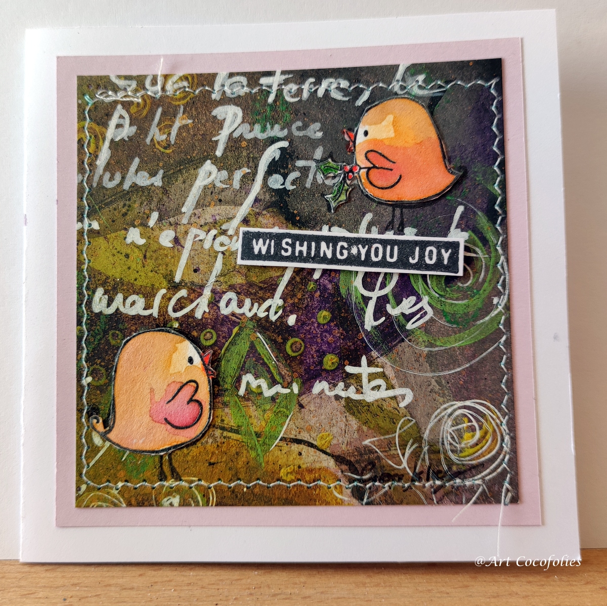 Une variante à présent, avec ces mêmes tampons, mêlés à « PD8681 Tweetest Christmas », que vous reconnaitrez sans peine sur ma photo d’ensemble du matériel à la fin de cet article. Une carte cousue à la main, faite sur un fond qui me restait à la Gel plate. J’y ai ajouté le tampon « Le bonheur n’est réel que partagé », un ancien tampon bois de Chou&Flowers.