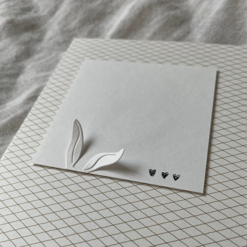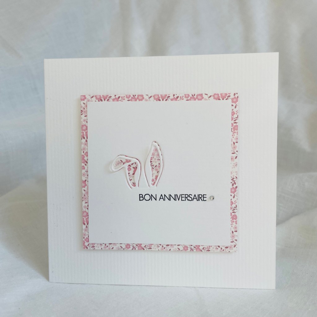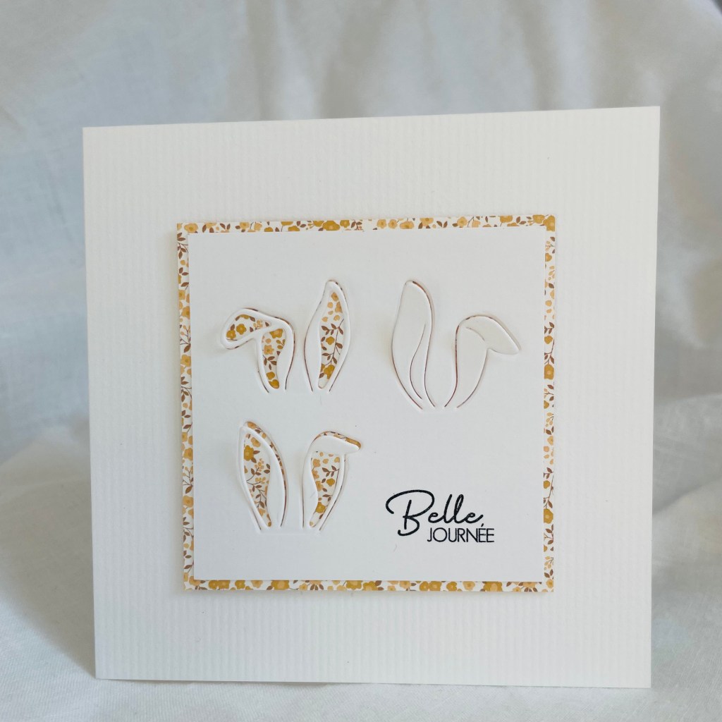 Sur une base carrée de 11.5×11.5cm, j’ai collé avec de la mousse 3D double face un carré blanc sur lequel les dies oreilles de lapinou avaient été positionnés.