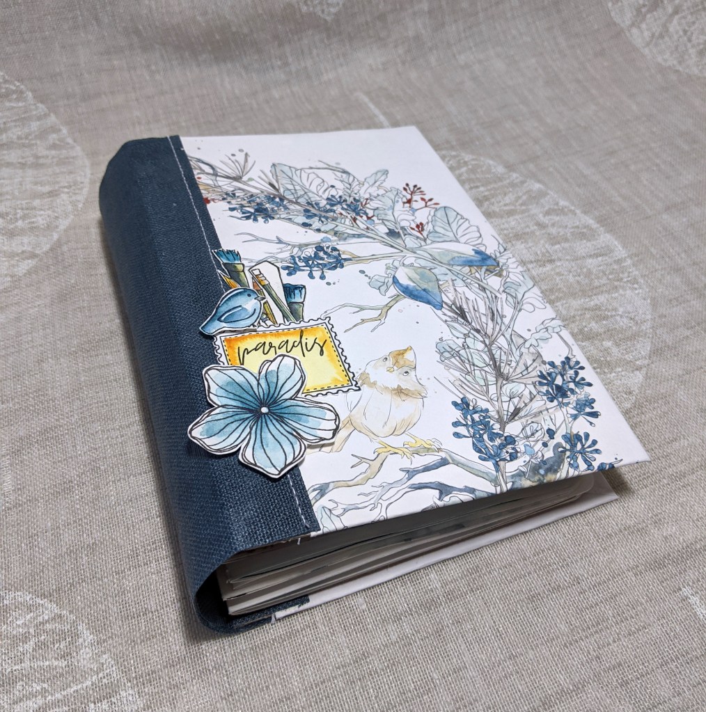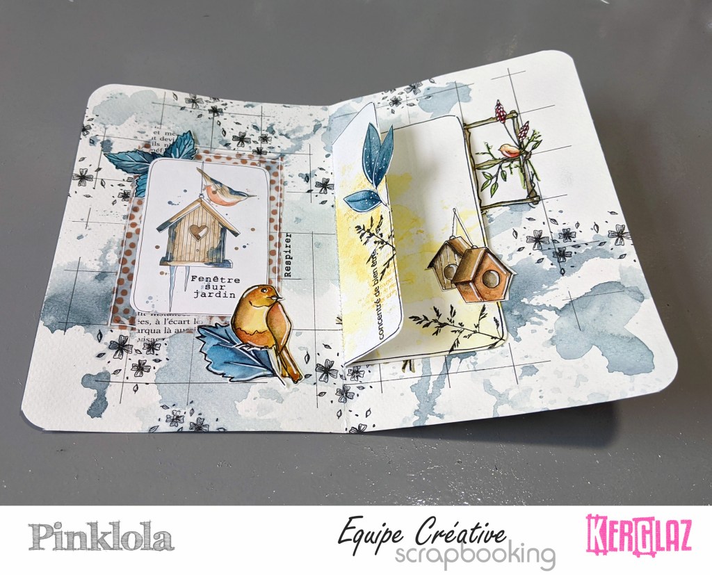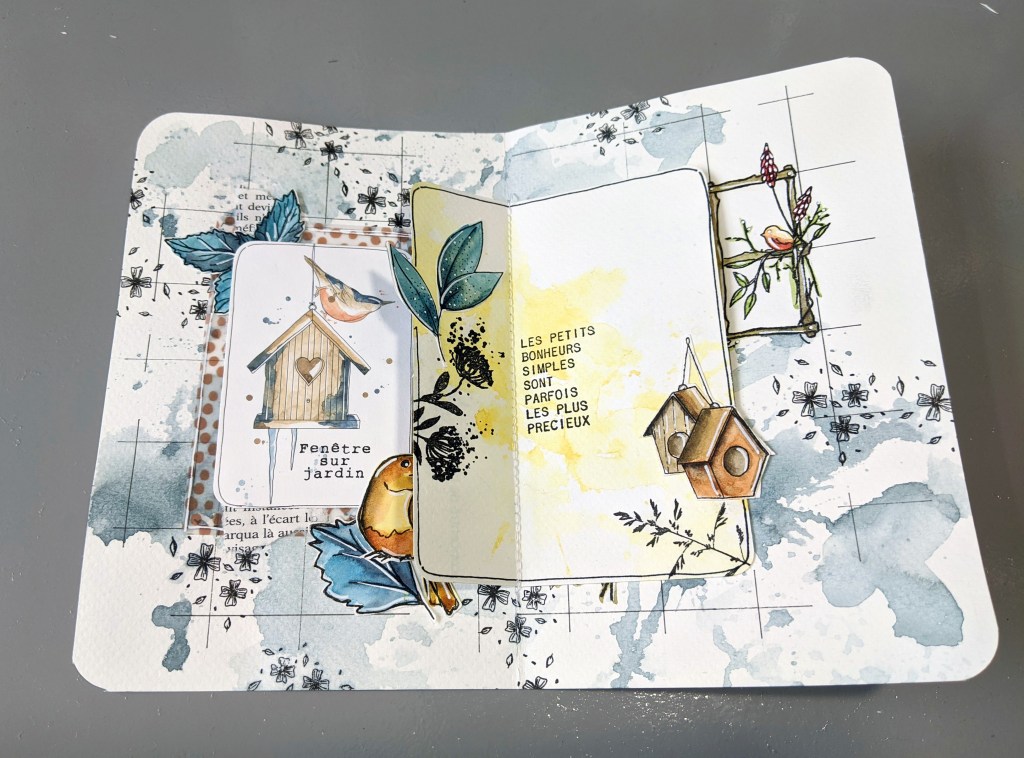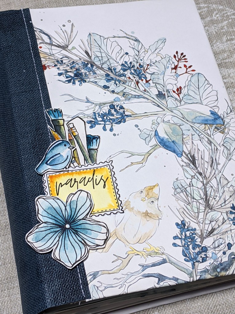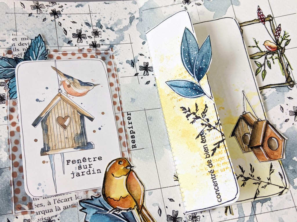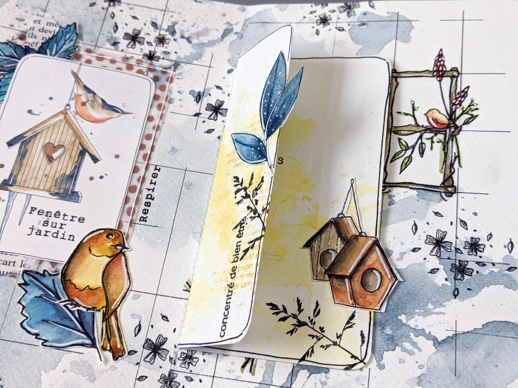 Mes timbres sont tamponnés directement en place, et colorisés légèrement aux encres Distress et crayons Néocolor II. Vous avez un aperçu de mon processus un peu plus bas, et vous pouvez aussi retrouver sur CE POST un autre exemple d’utilisation.