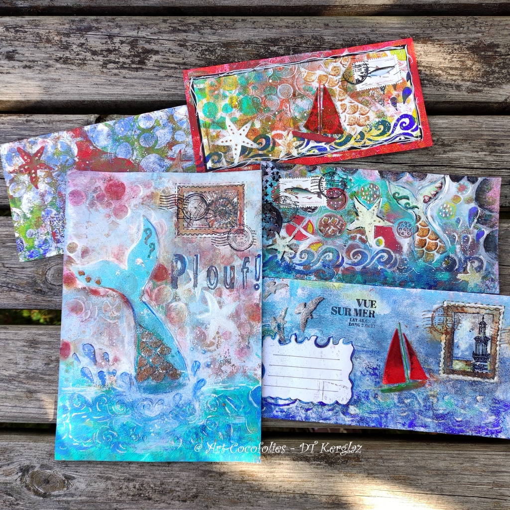 Comme j’ai toujours du mal à m’arrêter quand je commence Lol, au final, j’ai altéré 5 enveloppes, en jouant avec différents pochoirs, mon nouveau die de petit bateau que j’adore, un peu de peinture, feutres Posca et crayons Néocolor II, quelques tampons de faux timbres sur le thème de la mer, et mes Izink Diamond pour le côté pailleté, la cerise sur le gâteau … 😀 Mais si vous n’avez pas d’acryliques, vous pouvez tout à fait réaliser ce projet aux encres Distress et Distress Oxide par exemple. J’essaierai d’en réaliser un autre exemple ultérieurement pour vous le montrer.