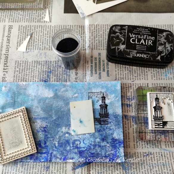 Mon projet en images, à différents stades. Vous pouvez voir ainsi le matériel que j’ai utilisé, la plupart de ce matériel et produits se trouve en boutique. Je vous en donne la liste complète en fin de post.