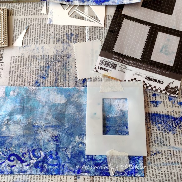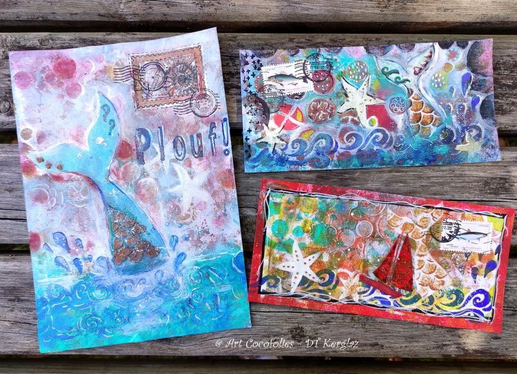 - Pochoirs (thème ronds vagues, oiseaux, mer…) (Art by Marlène, Giogiocraft, Carabelle Studio), et petit pochoir ‘Stamp’ pour la réalisation des faux timbres (Carabelle Studio)