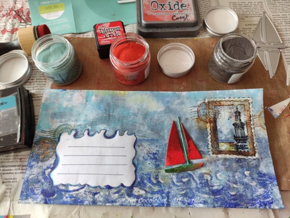 Je les ai colorisés aux encres Distress (photo de droite), puis embossés à la Distress Glaze (j’adore l’effet et la brillance délicate de ces poudres que je recommande !!)… Pour le bâteau du milieu, j’ai simplement utilisé un reste de fond réalisé à la gelplate et découpé un bateau dedans, puis j’ai rapidement rajouté quelques nuances de couleur turquoise.