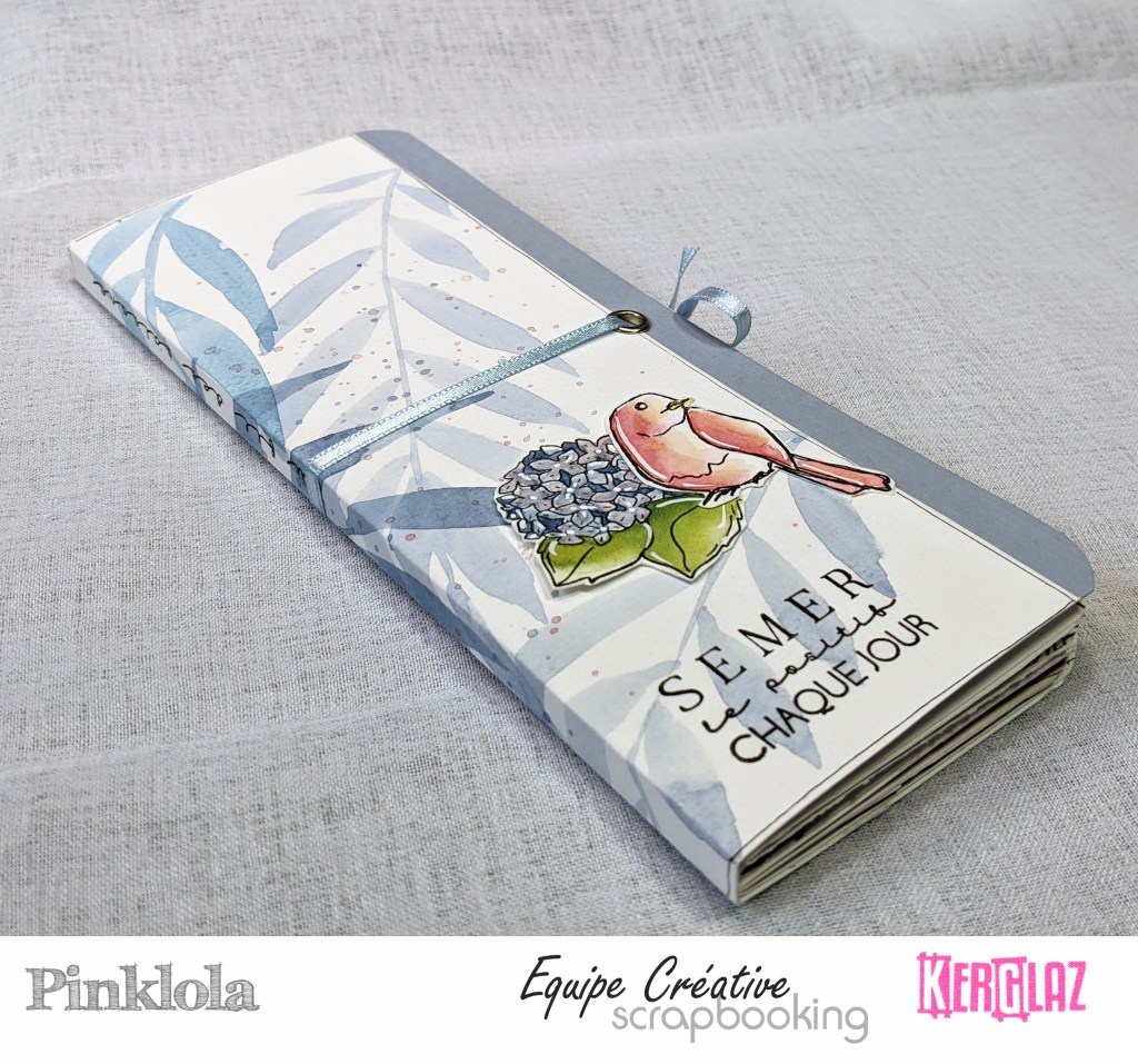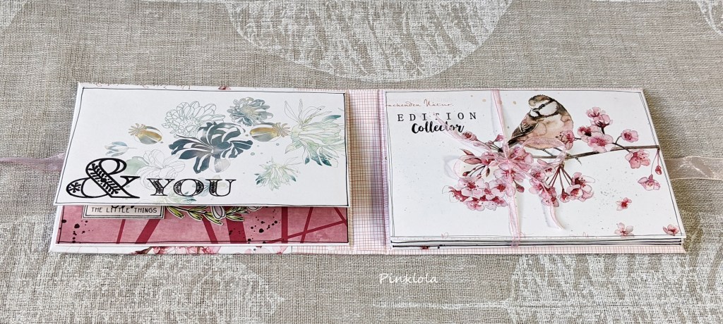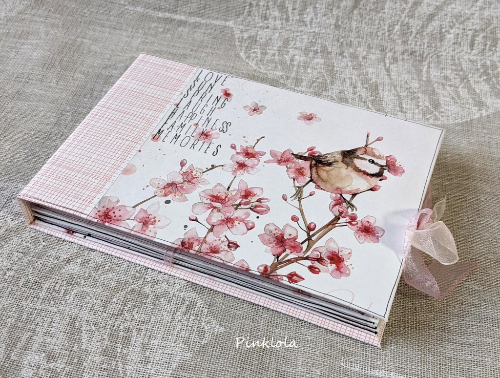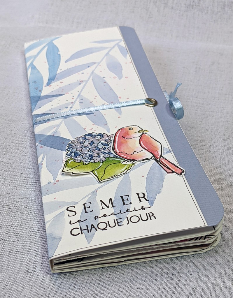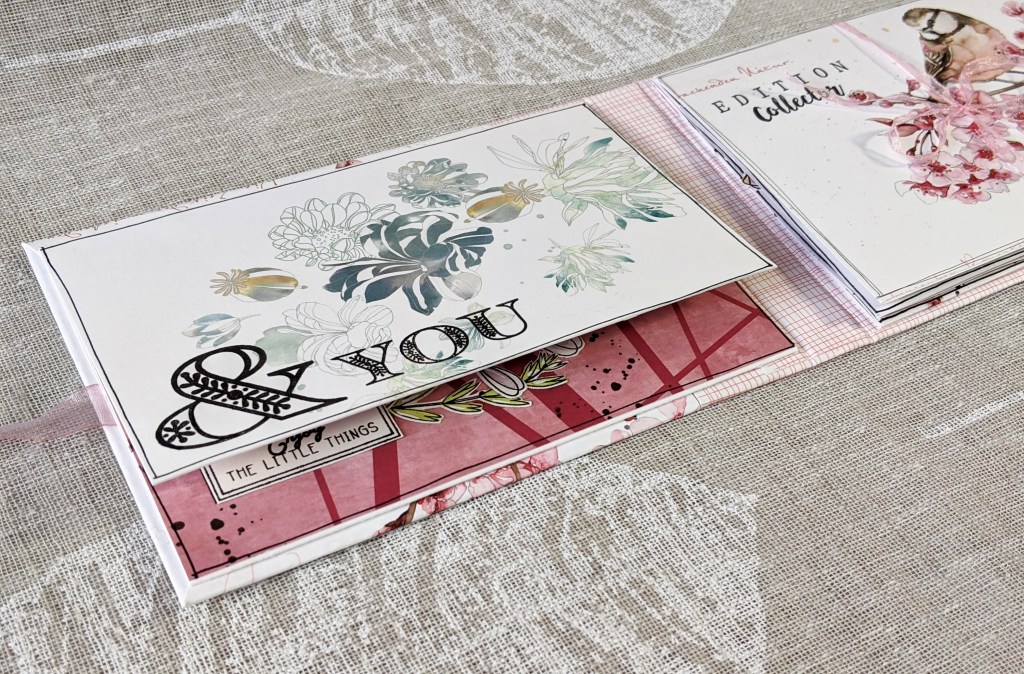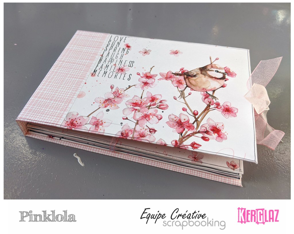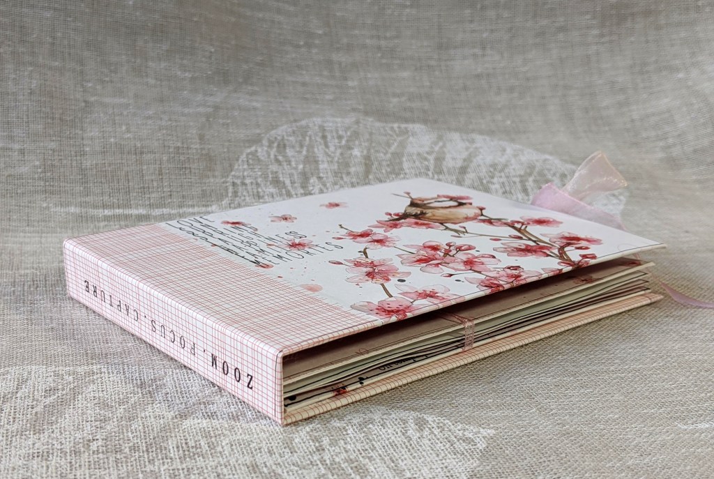 Et voilà… j’ai replacé une dernière fleur légère sur ma couverture arrière, et mis quelques rubans aux couleurs assorties.