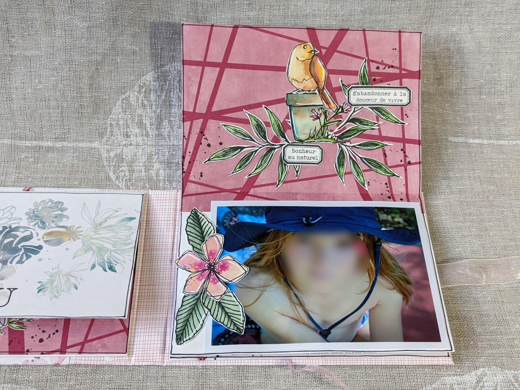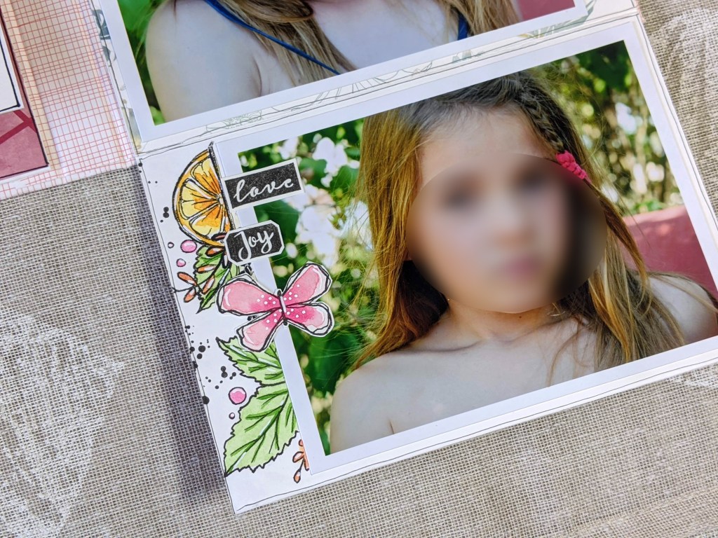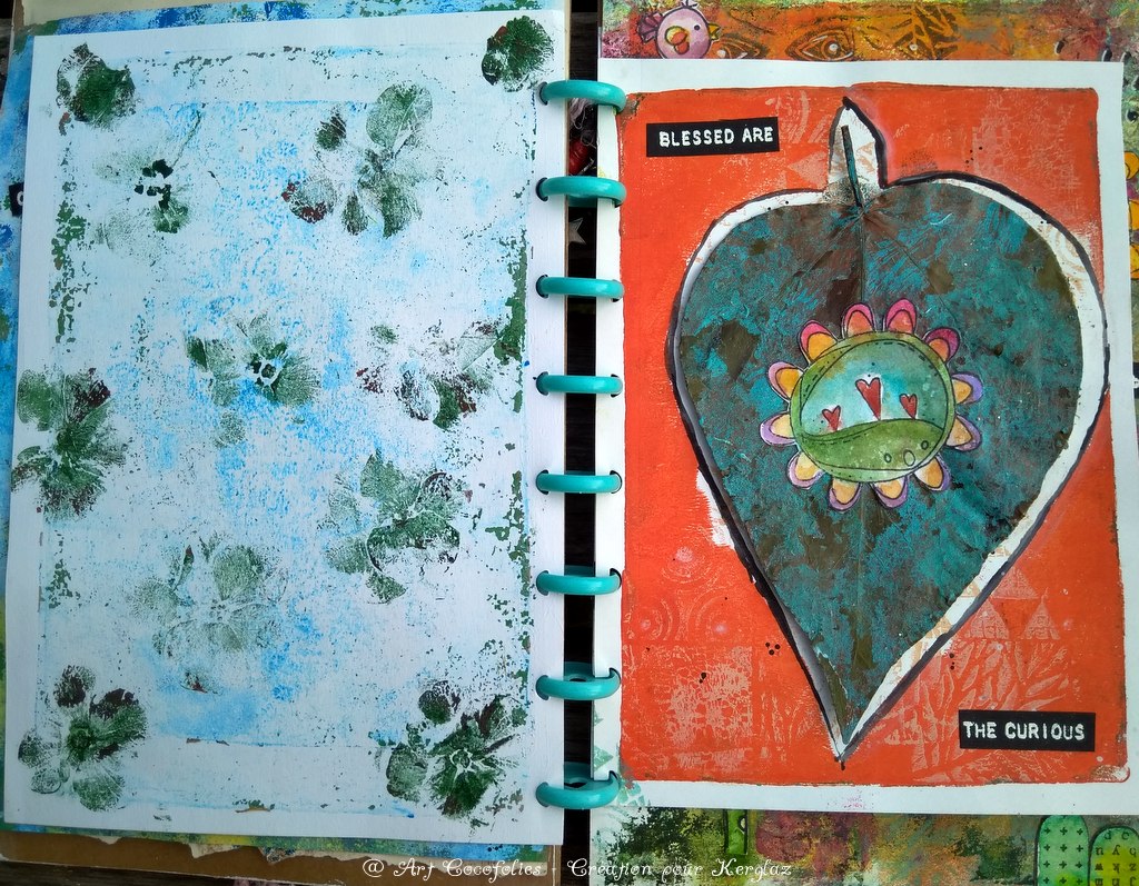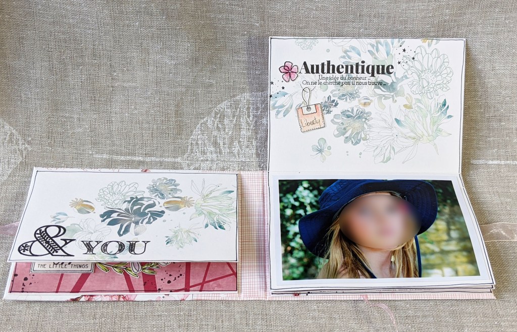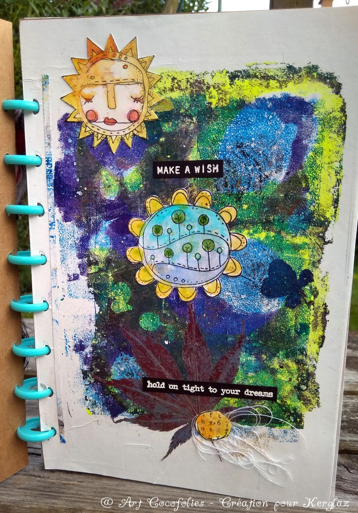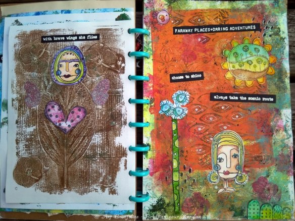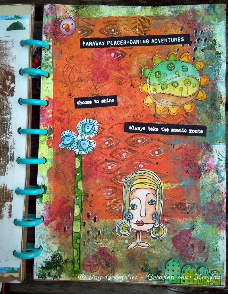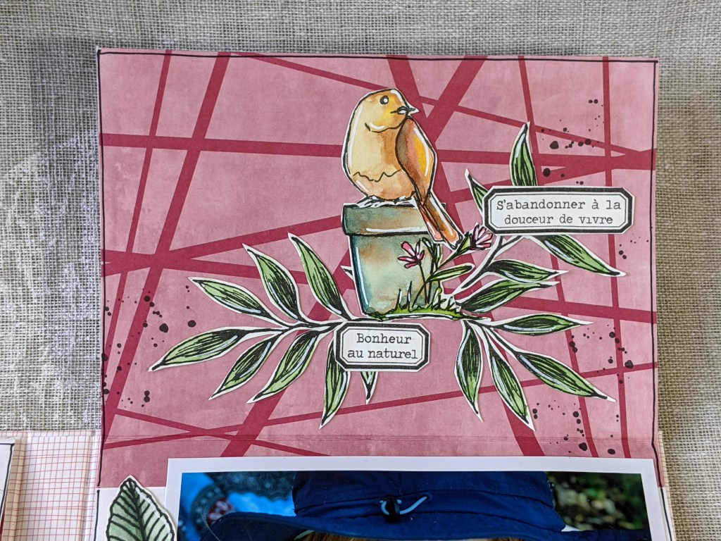 J’aime beaucoup la douceur de cette première page, qui mêle des éléments naturels à ces adorables tampons Art Dolls et Sunflower Doodles.