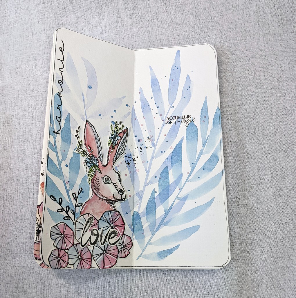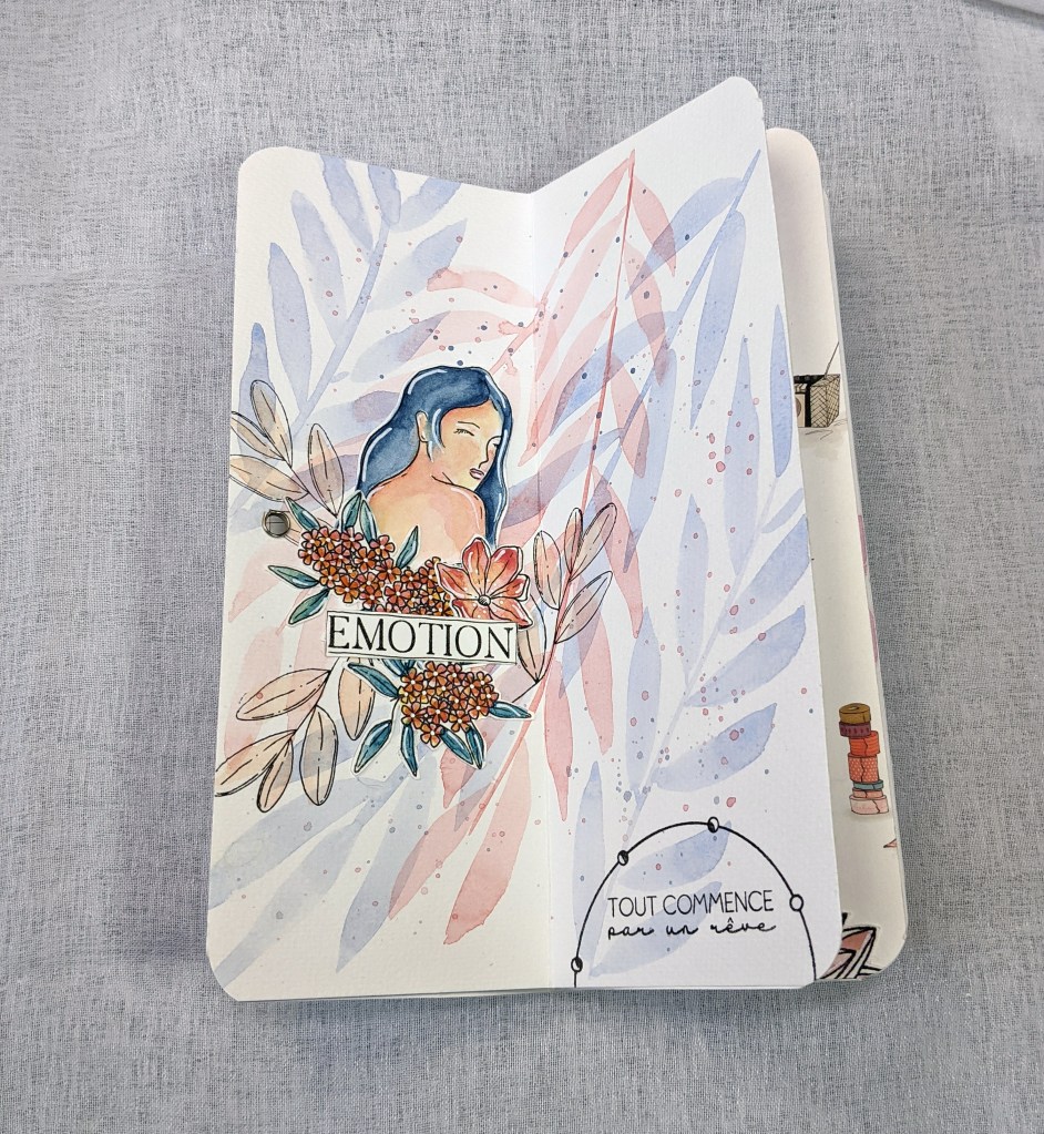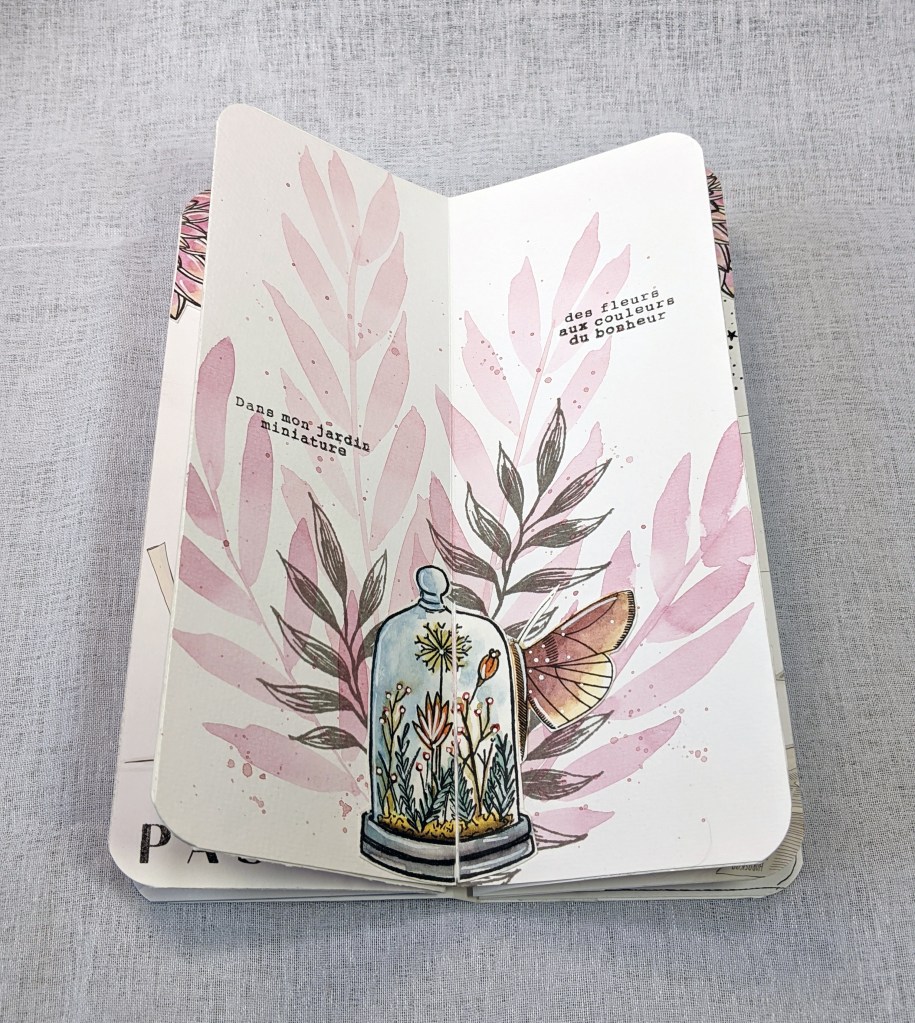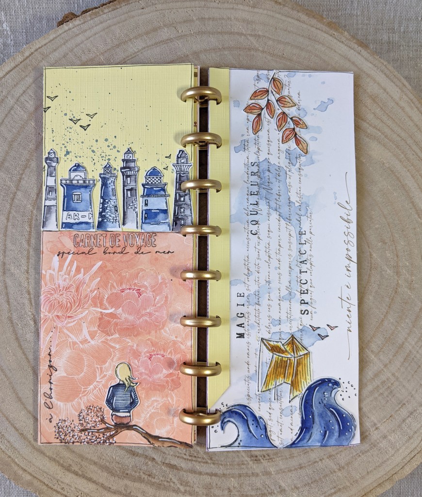 Page de droite, j’ai joué avec du papier Yupo et des encres à alcool de ce SET… J’aime la vivacité des couleurs obtenues, sur ce papier brillant à la texture particulière. Si vous avez envie de faire des essais comme moi aussi, vous pouvez l’acheter à la feuille, c’est pratique, vous en avez plusieurs sortes en boutique. 🙂