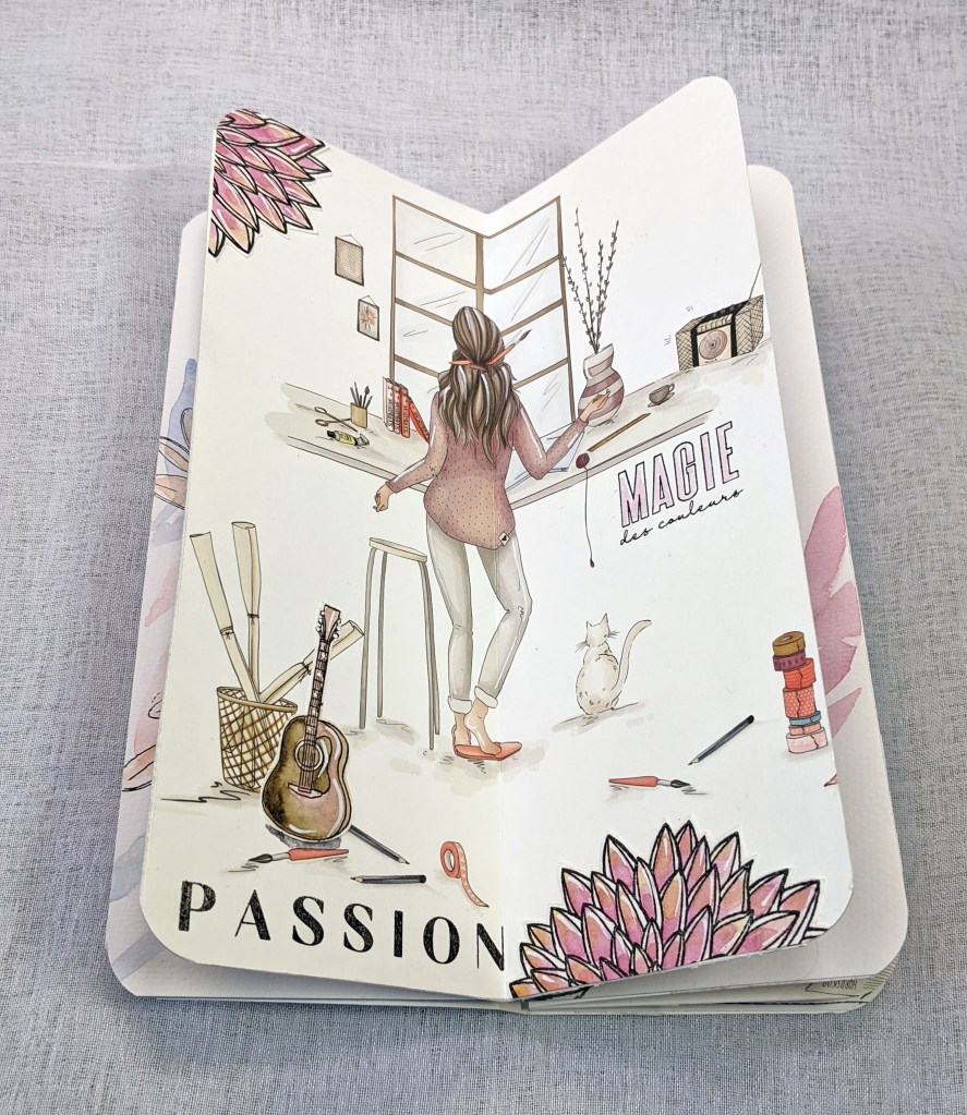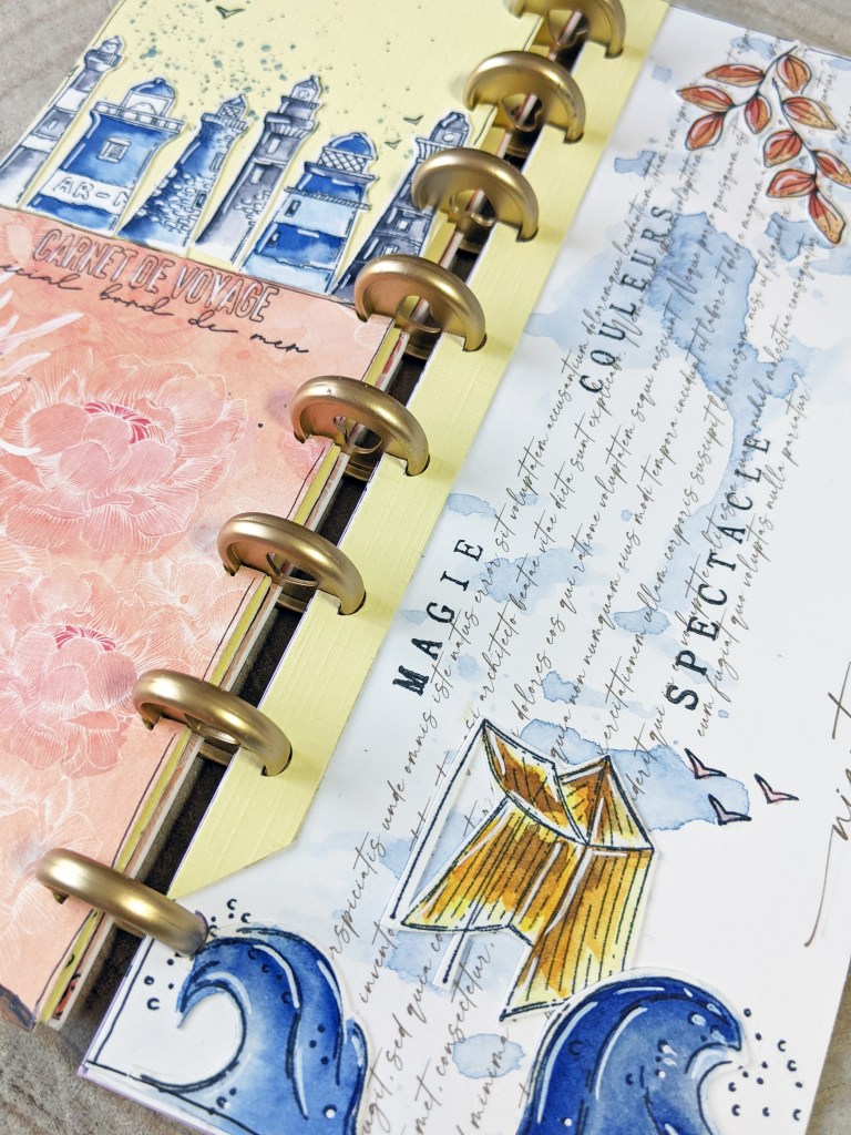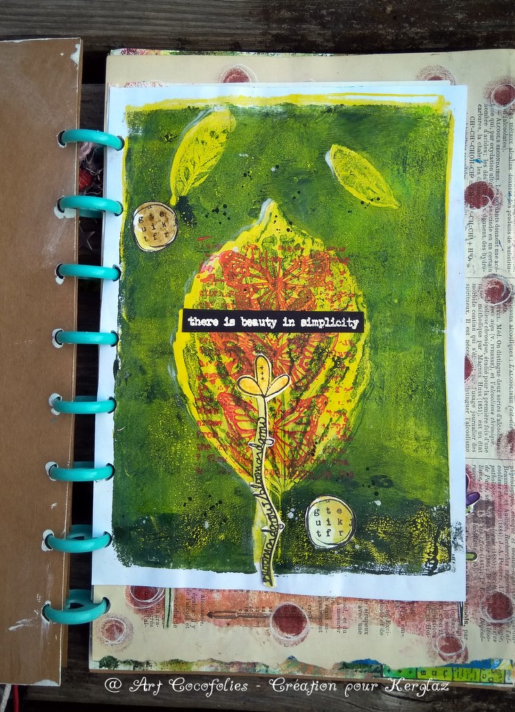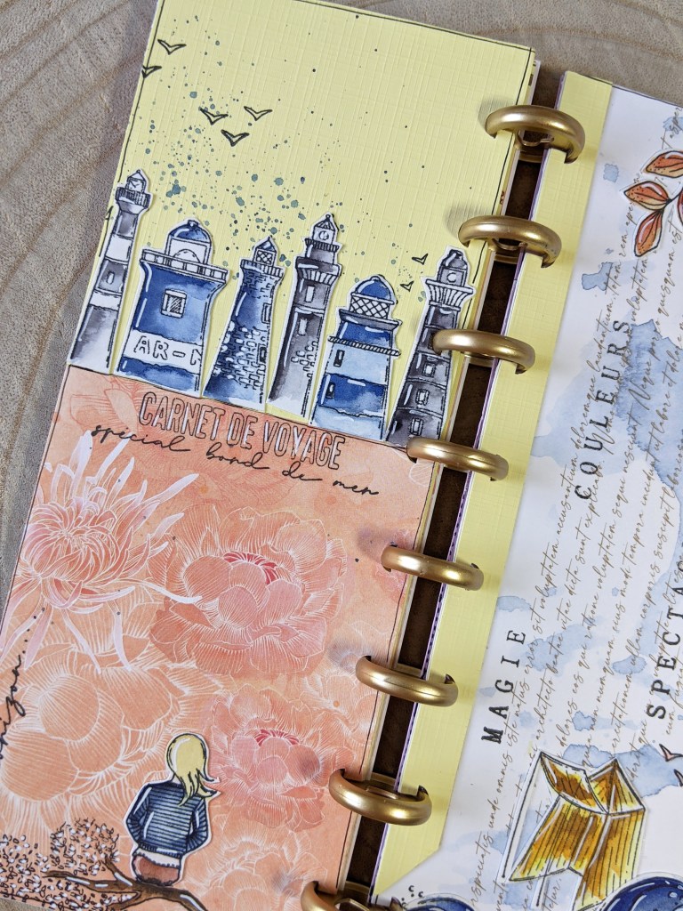 Page de droite, j’ai joué avec du papier Yupo et des encres à alcool de ce SET… J’aime la vivacité des couleurs obtenues, sur ce papier brillant à la texture particulière. Si vous avez envie de faire des essais comme moi aussi, vous pouvez l’acheter à la feuille, c’est pratique, vous en avez plusieurs sortes en boutique. 🙂