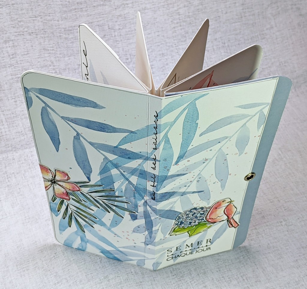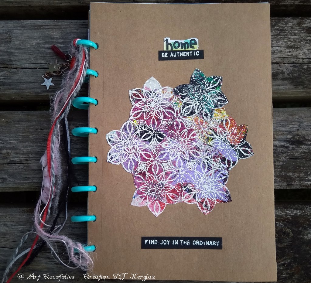Sur ma page de couverture, j’ai collé ces belles fleurs ‘Stained Glass Flowers’, tamponnées et embossées en blanc sur une chute de papier palette couvert de peintures (voir la première partie de cet article ICI pour les détails de réalisation).