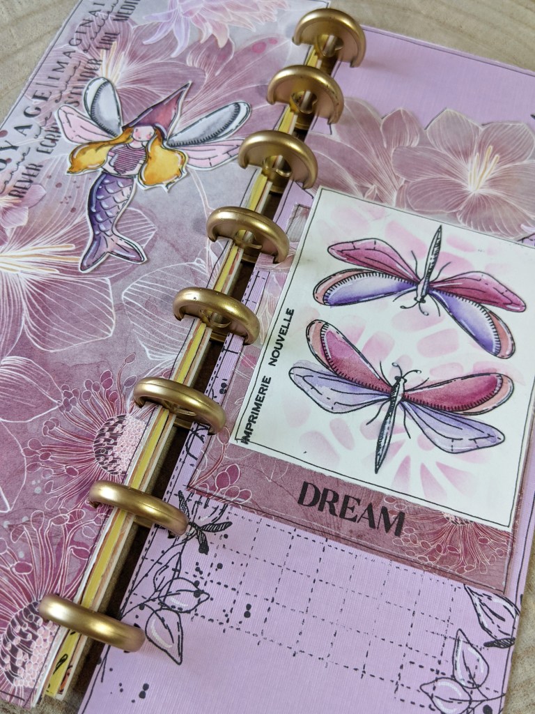 Sur la page de gauche, j’ai tamponné ur du vellum et embossé à la poudre Wow! rose pailletée un des papillons… J’aime beaucoup cette petite art doll au gros ventre 😀