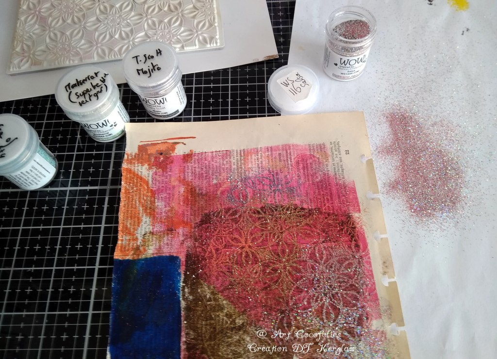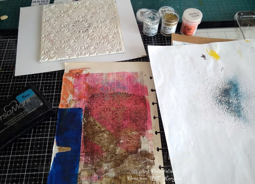 Sur la double page ci-dessus, on voit bien l’effet de toutes les poudres d’embossage Wow! appliquées. De près, cela brille vraiment de plusieurs couleurs, c’est très beau !!!