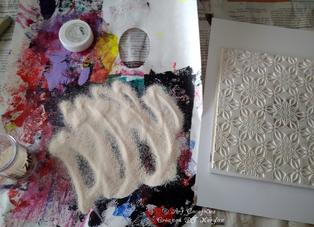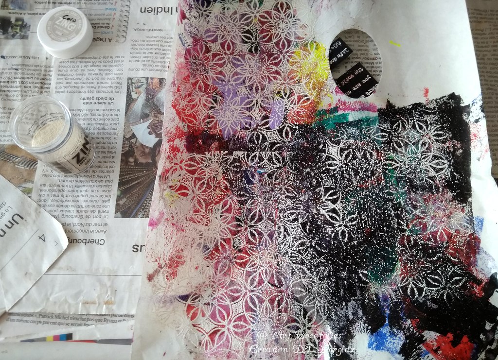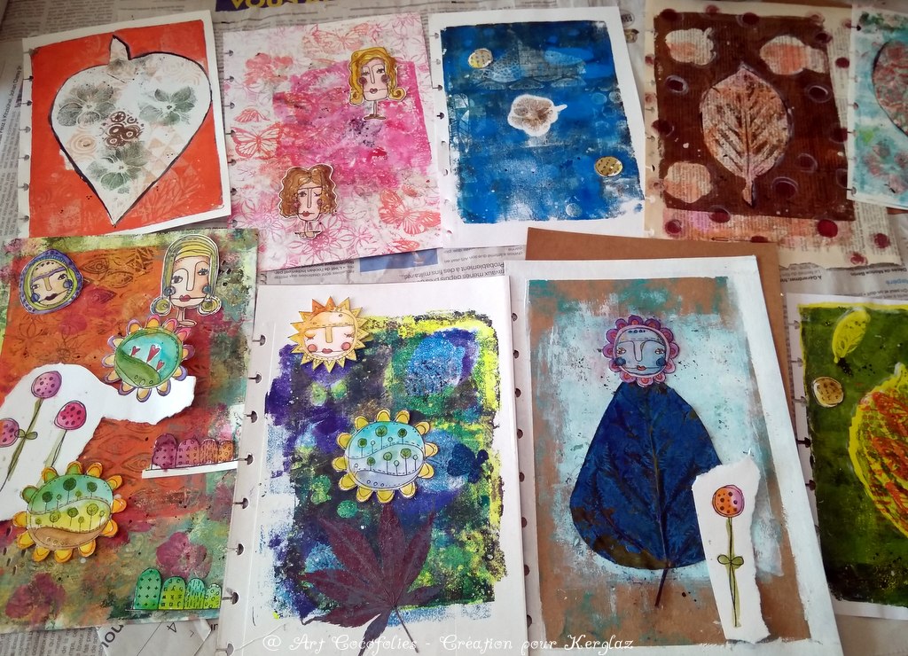 Et aussi … Gel Plate (vous en avez de différentes formes et tailles, voir par exemple ici, là ou là) et brayer, papier aquarelle Florence et Yupo, peintures aquarelles, acryliques au départ des fonds, Gesso blanc, feutre Posca blanc, encres versafine Clair (noir et rouge tulipe)