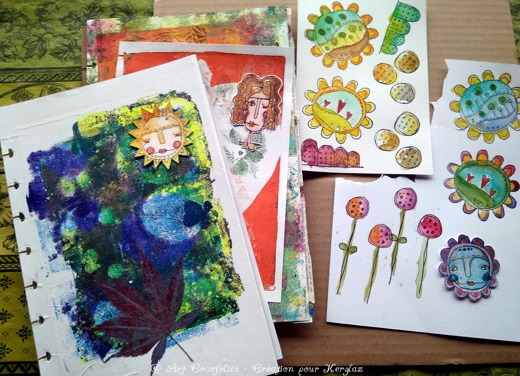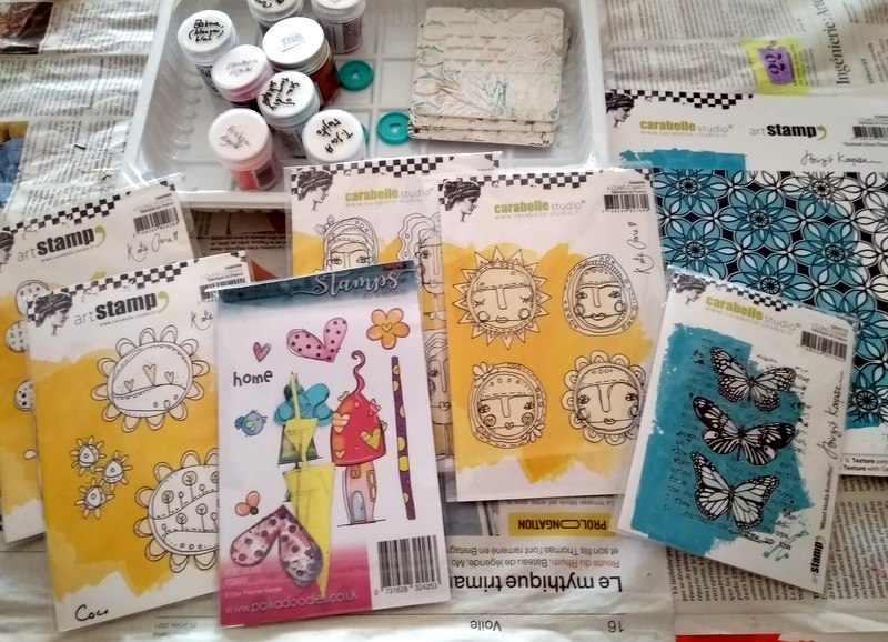 Tampons Birgit Koopsen ‘Stained Glass Flowers’, ‘Mixed media Butterflies’, Kate Crane ‘Journal Doodles’, ‘Art Dolls’, ‘Sunflower Doodles’, ‘Face It’, Art texture (Carabelle Studio),