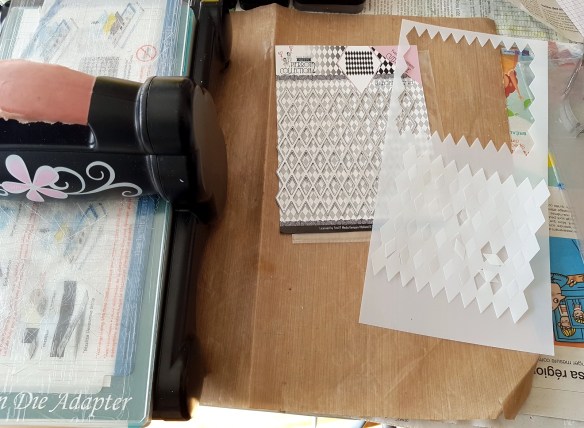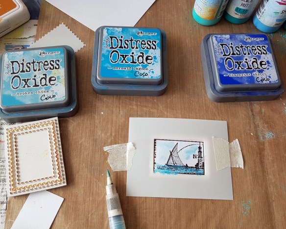 Puis j’ai tamponné par dessus un cadre festonné aux bonnes dimensions (voir photo ci-dessous). J’ai placé ensuite sur mon image centrale le pochoir rectangle qui s’adapte également parfaitement aux dimensions de ces tampons, pour ne laisser que l’image apparaître. Je l’ai alors grossièrement colorisée, de manière assez lâche, sans craindre de déborder grâce à la protection du pochoir maintenu par un peu de masking-tape.