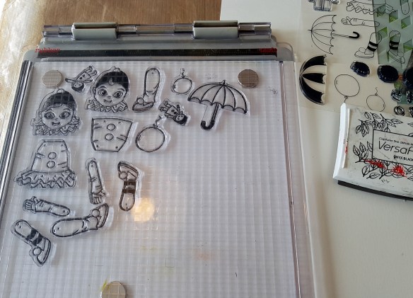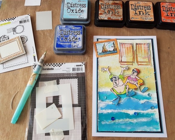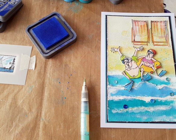 J’ai découpé mon fond de carte dans un de ces fonds. Puis j’ai tamponné sur du papier Florence ce couple de petits vieux se précipitant dans l’eau, il s’agit d’un tampon humoristique d’Art Impressions (Swim couple, dans la collection Golden Oldies). Il n’est plus en stock, mais vous pouvez peut-être envoyer un message à Hélène pour lui demander si elle peut vous l’obtenir lors d’une prochaine commande de ces tampons assez amusants pour la plupart.