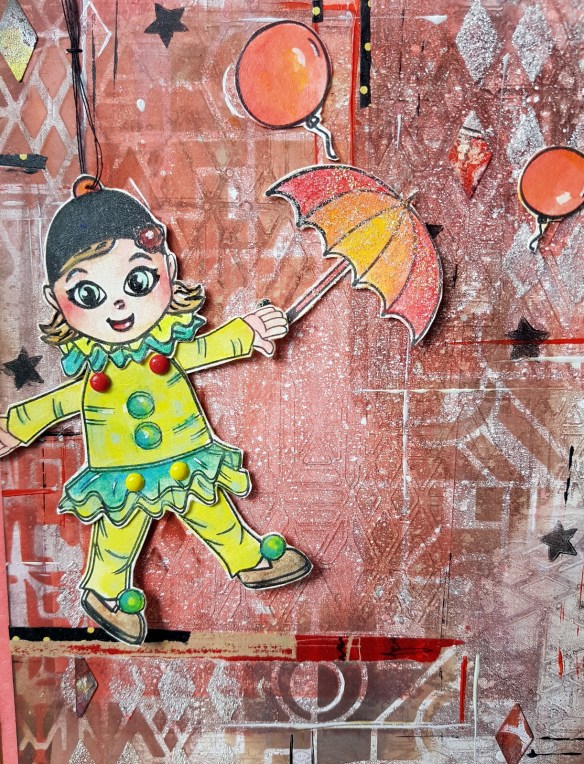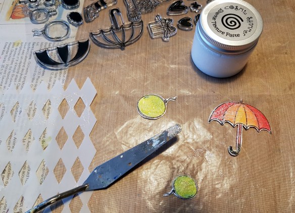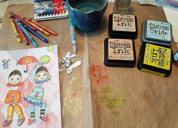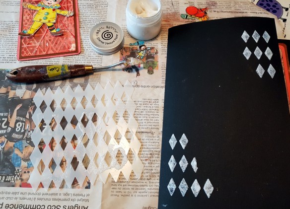 J’ai légèrement recolorisé mes fauteuils aux encres Distress, et appliqué aussi un peu de Gesso blanc sur mes bandes déchirées et mes chaises.